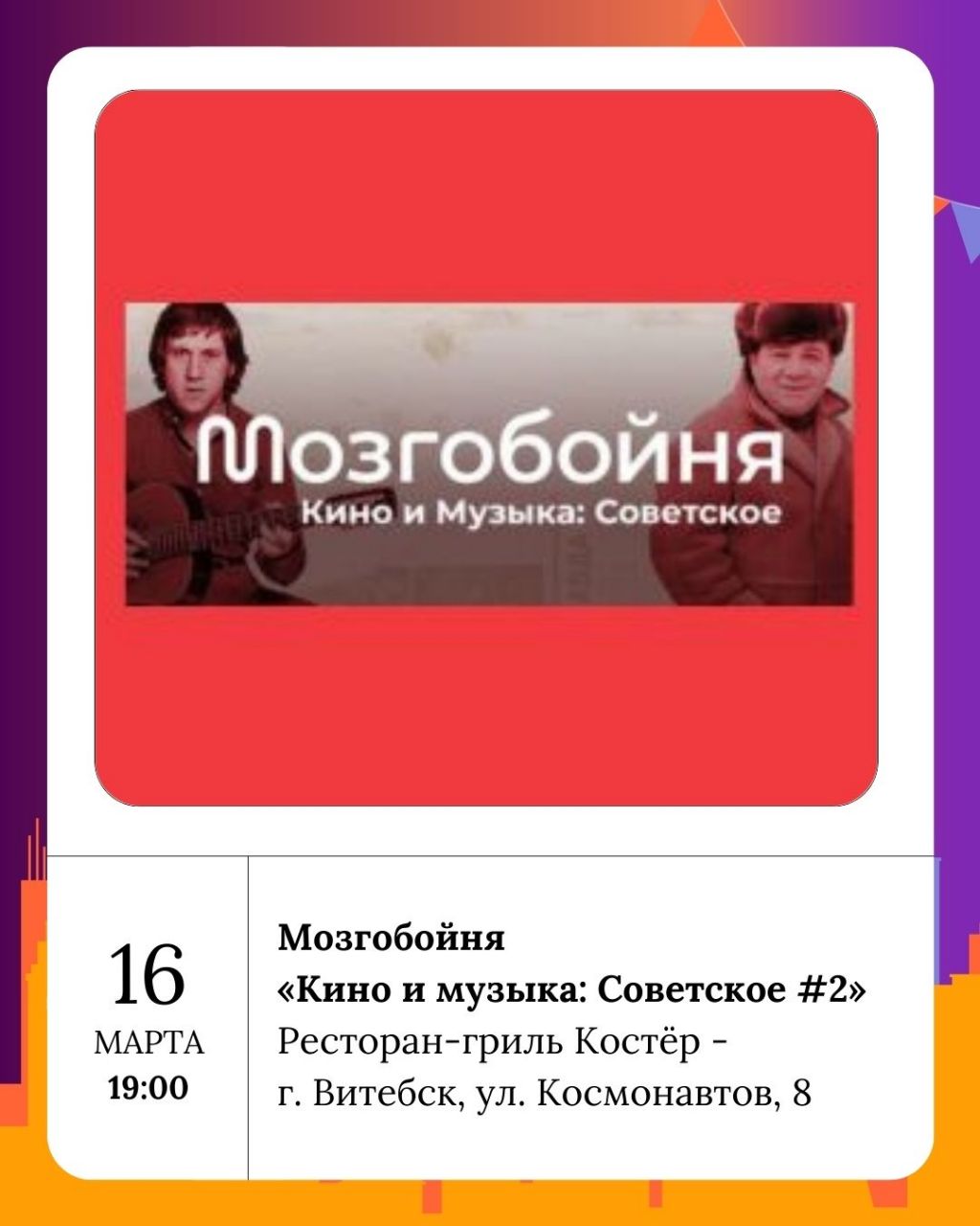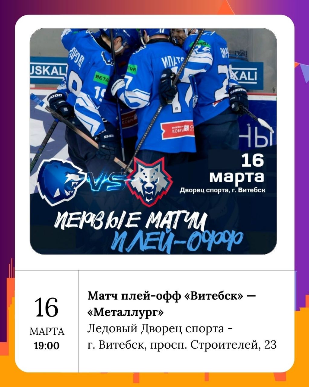 На льду Ледового Дворца спорта состоится решающий матч плей-офф, где местная команда «Витебск» сразится с «Металлургом». Болельщики, готовьтесь к напряженной борьбе и поддержке любимой команды! А для тех, кто предпочитает интеллектуальные развлечения, в этот же день пройдёт игра «Мозгобойня» на тему «Кино и музыка: Советское #2». Вспомните любимых актеров и мелодии прошлых лет в дружеской атмосфере.