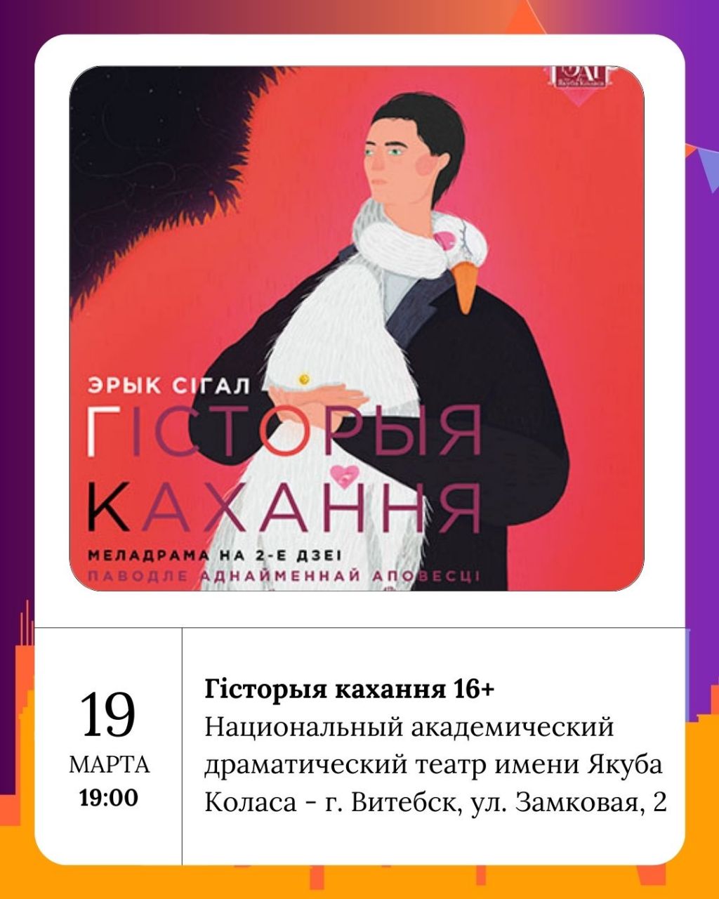Затем Национальный академический драматический театр имени Якуба Коласа вновь пригласит зрителей на спектакль «Гісторыя кахання» (16+), обещая глубокое и эмоциональное погружение в историю отношений.