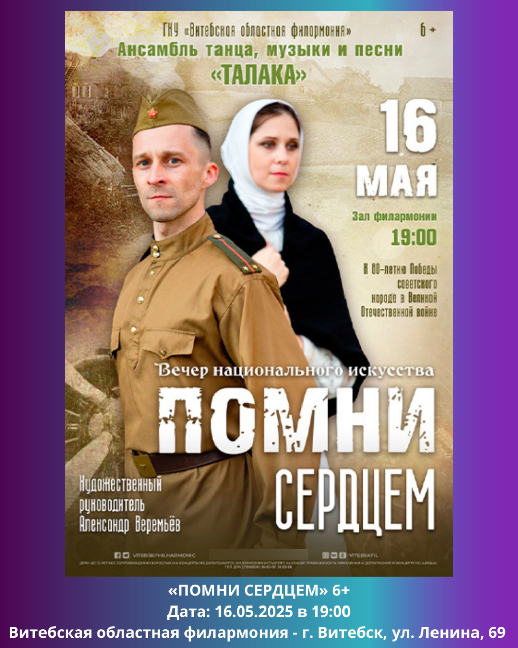 Ансамбль танца, музыки и песни "Талака" Витебской областной филармонии 16 мая представит театрализованную программу "Помни сердцем", приуроченную к 80-летию Победы советского народа в Великой Отечественной войне.