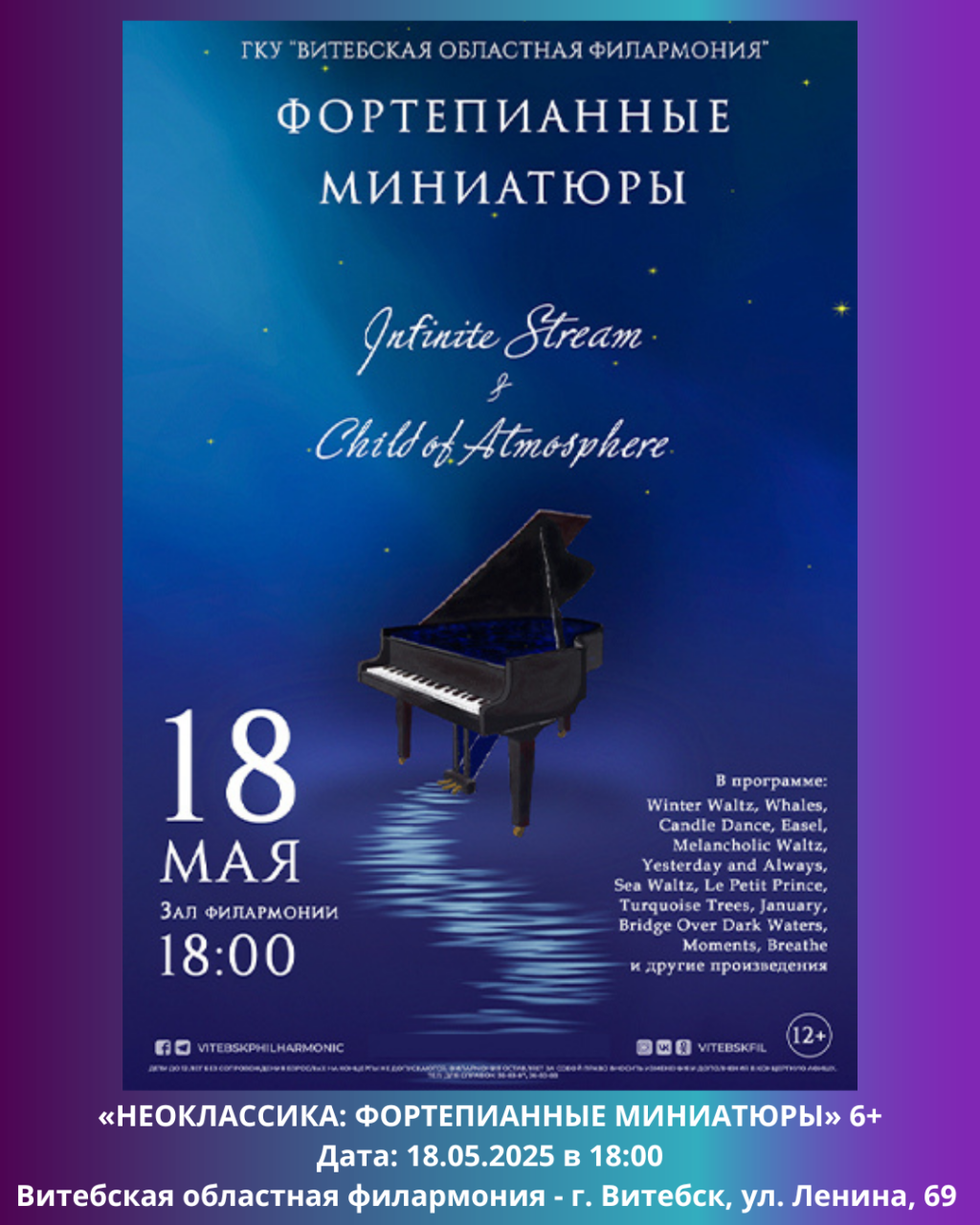 Зрители концерта «Неоклассика: фортепианные миниатюры» в воскресенье услышат авторские работы Infinite Stream (Санкт-Петербург) и Child of Atmosphere (Витебск) — современные фортепианные пьесы, где простота звучания открывает глубину переживания.