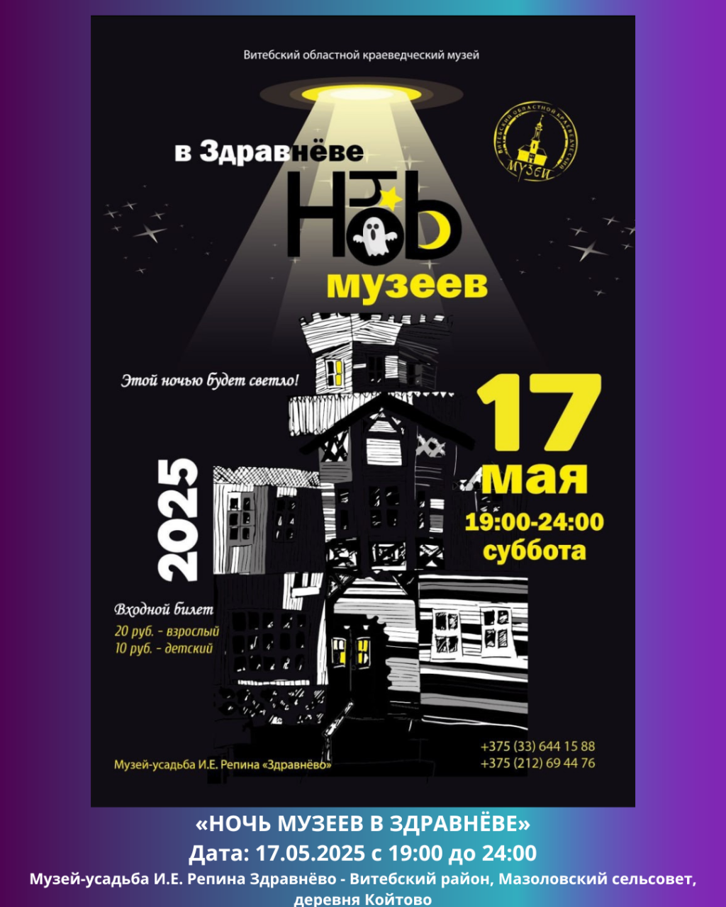 Уже завтра пройдет самая загадочная «Ночь музеев в Здравнёве». .Будет приятно музыкально, увлекательно, интересно, уютно и волшебно, и вы получите вечерний отдых-релакс! Кстати, для нашего удобства и доставки посетителей на мероприятие ОАО «Витебскоблавтотранс» организует рейсы городского транспорта - автобус №68 «Железнодорожный вокзал - Здравнёво».