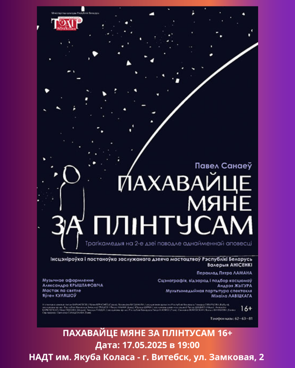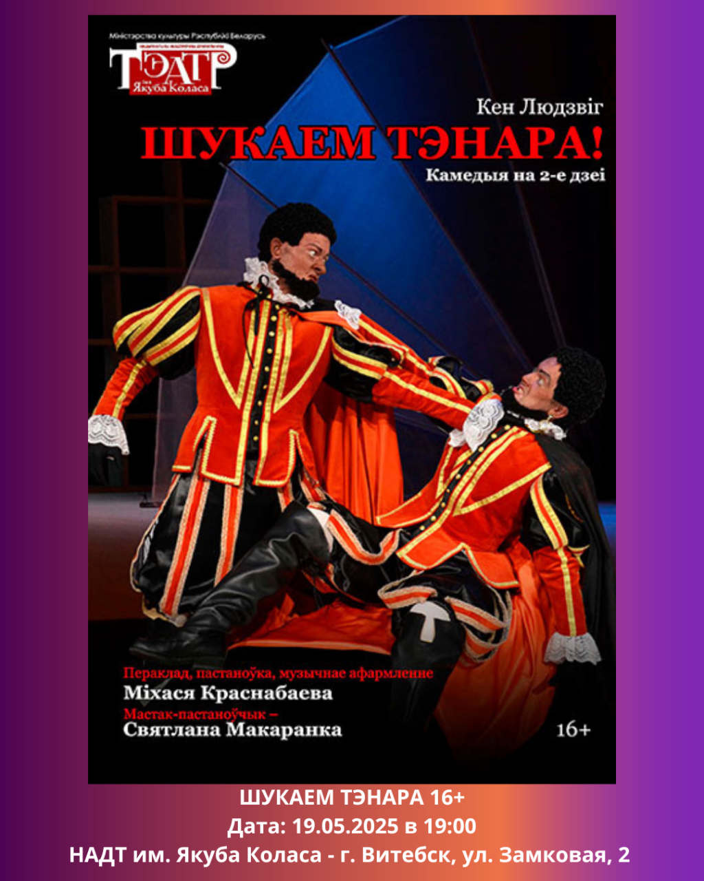Национальный академический драматический театр имени Якуба Коласа во вторник приглашает на спектакль Пахавайце мяне за плінтусам 16+, а в четверг - на Шукаем тэнара 16+.
