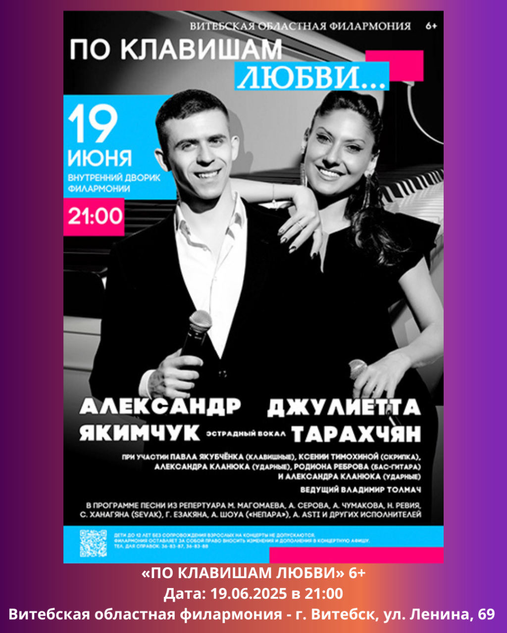В витебской областной филармонии пройдет концерт «По клавишам любви» 6+. В программе песни из репертуара М. Магомаева, А. Серова, А. Чумакова, Н. Ревия, С. Ханагяна (Sevak), Г. Езакяна, А. Шоуа («Непара»), A. Asti и других исполнителей.