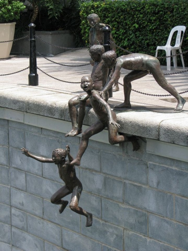 Эта действительно восхитительная работа находится около моста Кавенах в Сингапуре. Она напоминает о счастливых моментах первых лет жизни города, когда маленькие дети играли и купались в реке Сингапур без всякого беспокойства. Им не приходилось плавать в антисанитарных и загрязненных водах реки, дети качались на ветвях дерева и ныряли в реку. В 1983 стартовал проект Чистой Реки, дети и их семьи покинули область, их смех и купание остались в прошлом. Художник Чон Фа Чеонг нашел способ сохранить это счастливое прошлое в подарок горожанам и сделать его бессмертным. Он создал эту динамическую работу, изображающую пятерых мальчиков, играющих на берегу реки и прыгающих в воду.