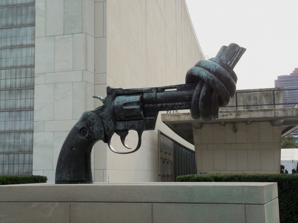 Месседж этой большой скульптуры очевидный и вдохновляющий. "Нет насилию" также называют Запутанным Оружием, символизирующим отказ от насилия. Вы можете найти скульптуру в Нью-Йорке, в штаб-квартире Организации Объединенных Наций. Если Нью-Йорк слишком далеко от вас, можно увидеть одну из 15 других копий скульптуры, распространенных по всему миру. Большинство из них располагается в Швеции, как и создавший скульптуры швед Карл Фредрик Рейтерсвард. Гигантский бронзовый револьвер Кольт Python 375 можно также встретить в Люксембурге, Германии, Франции, Швейцарии, Южной Африке и Китае. Рейтерсвард создал памятник против насилия после трагического убийства Джона Леннона.