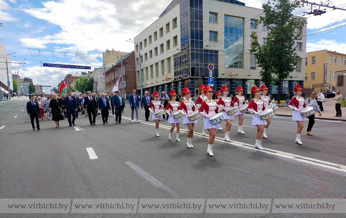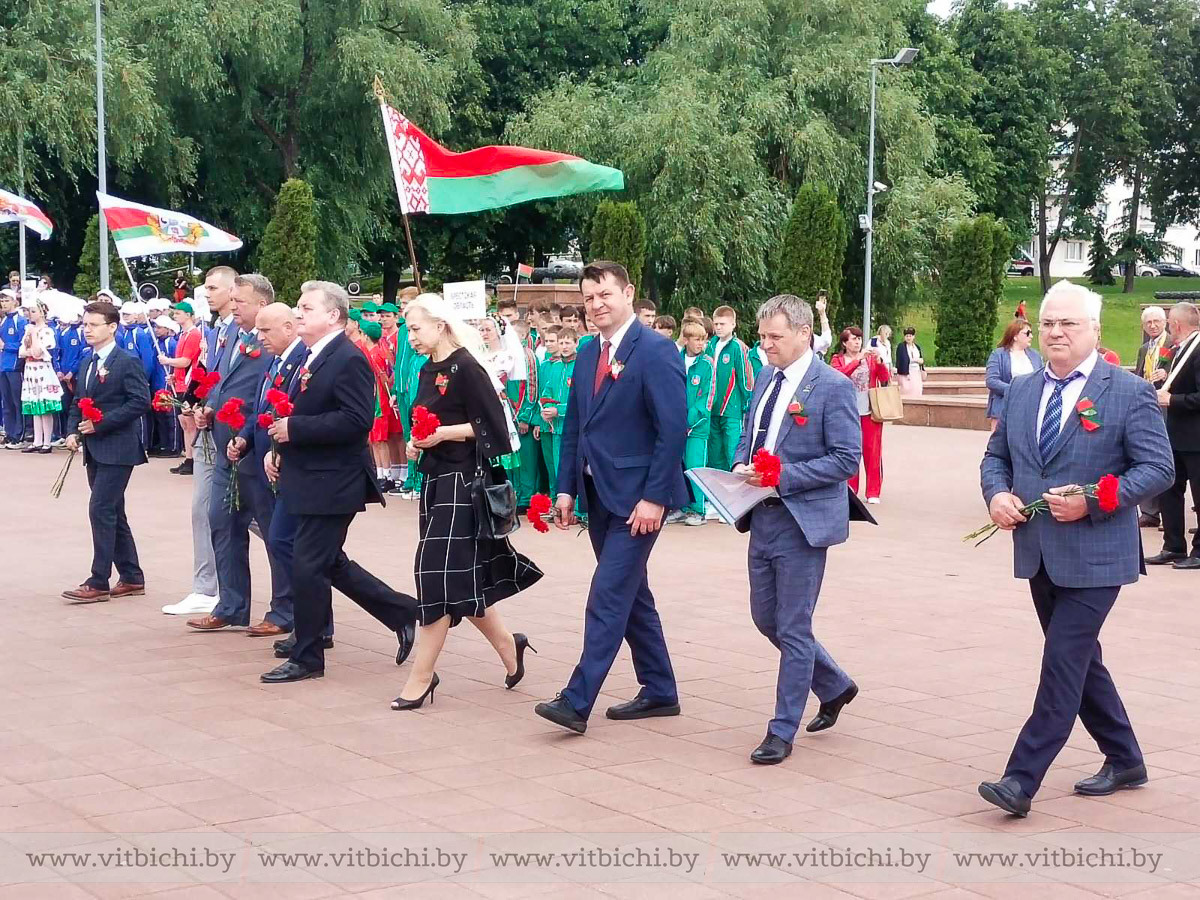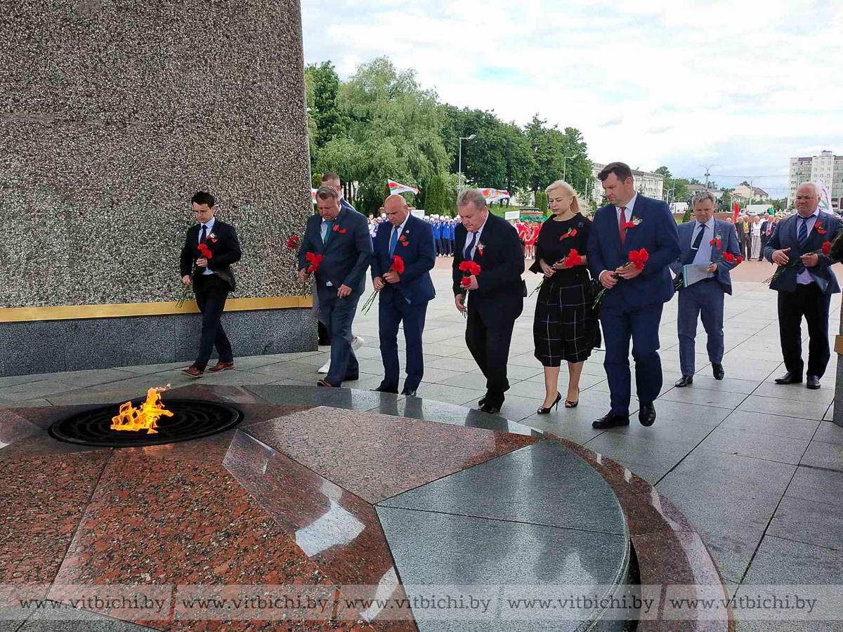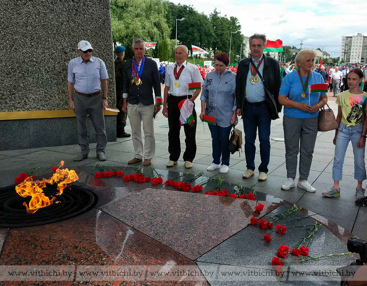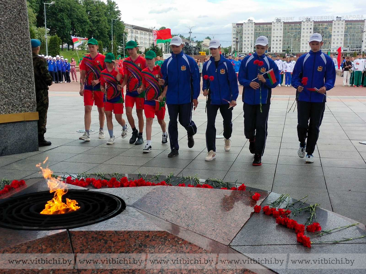 Участники спартакиады и представители власти возложили цветы к Мемориальному комплексу советским воинам, партизанам и подпольщикам. Мероприятие продолжило спортивно-массовое шествие "Молодежь. Единство. Спорт", от площади Победы к Летнему амфитеатру.