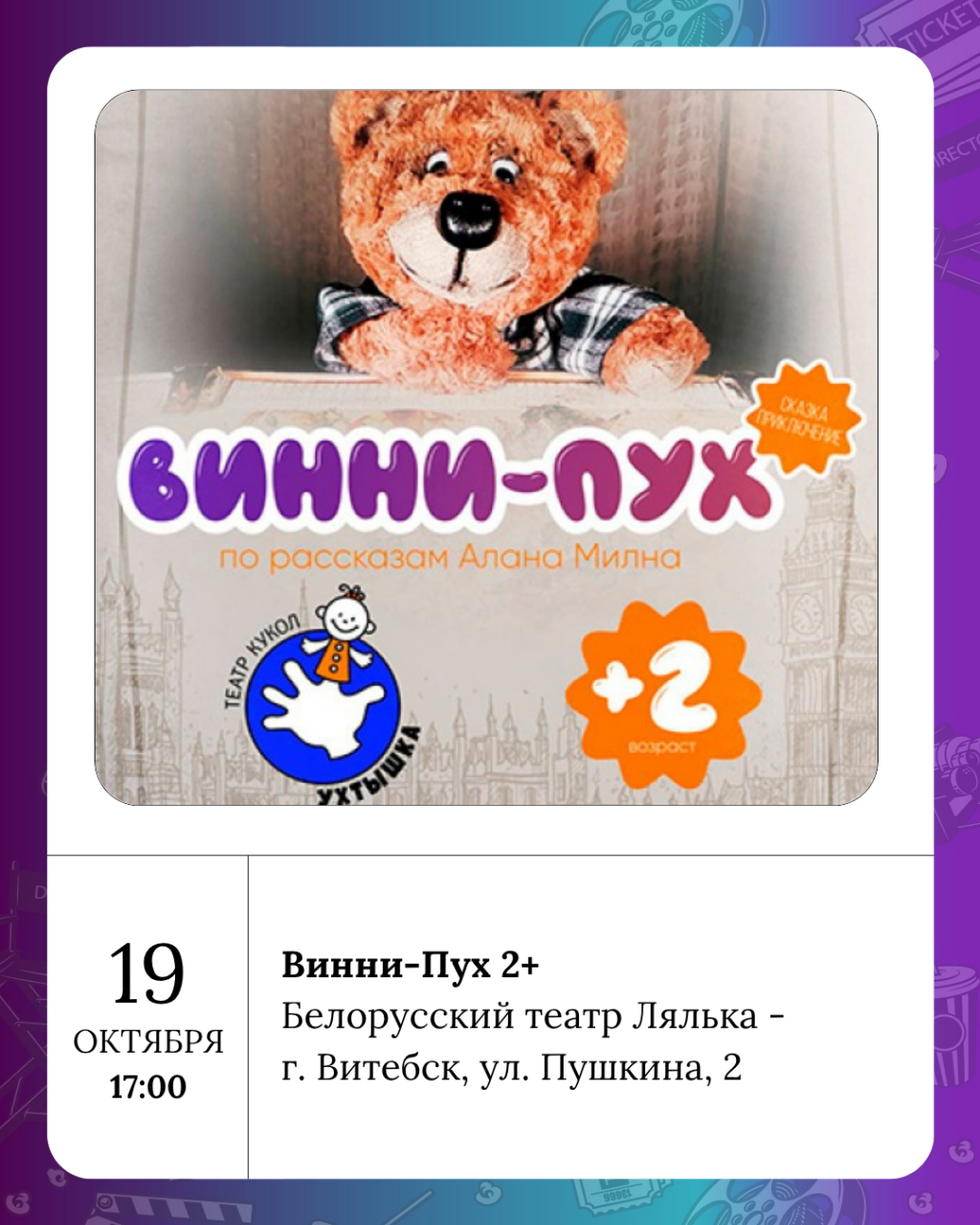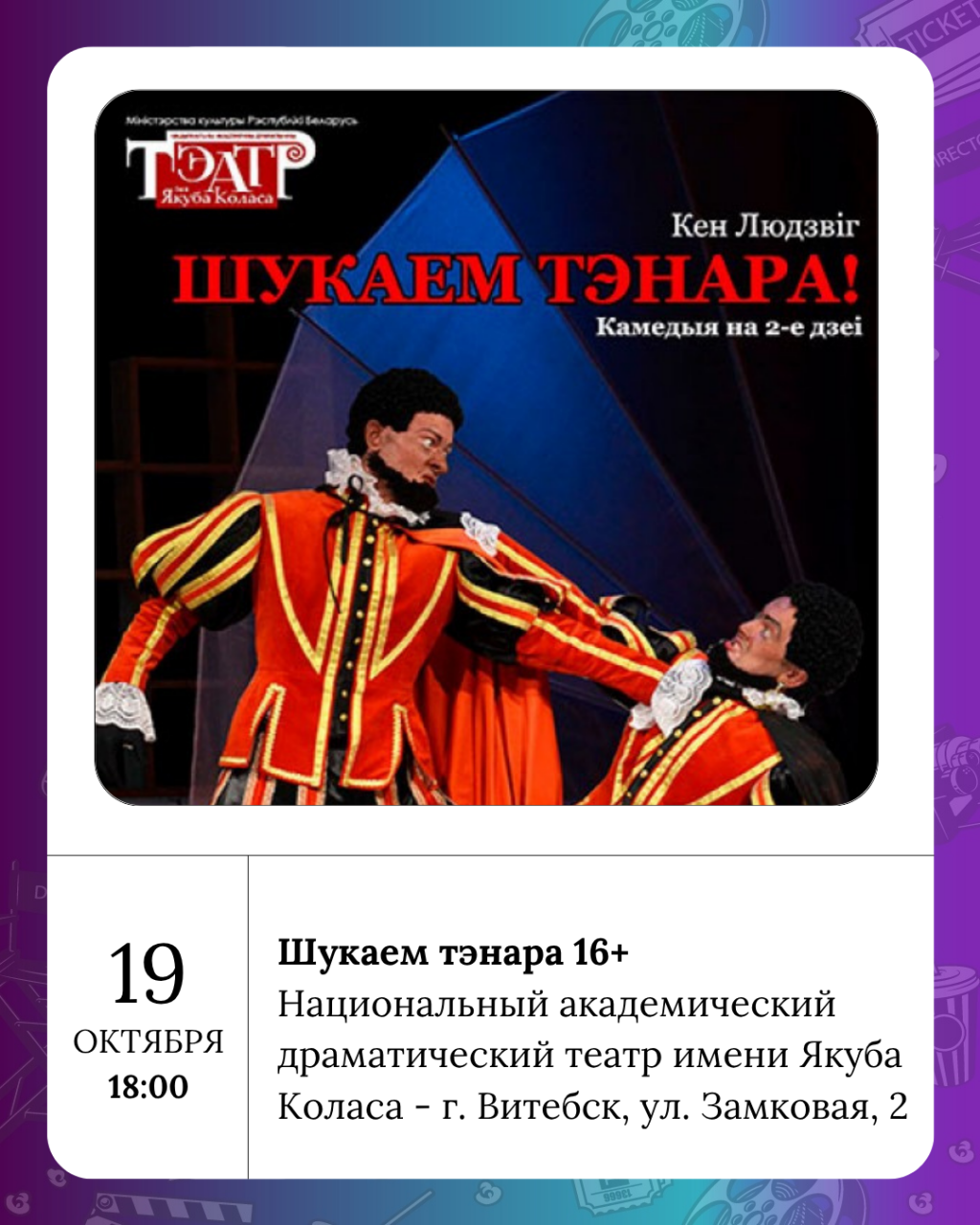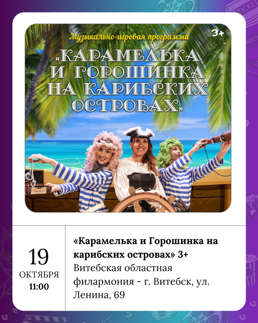 «Заложники любви» 12+ - в КЗ Витебск, Шукаем тэнара 16+ - в Коласовском, Фіндус 5+ и Винни-Пух 2+ - в Ляльке, «Карамелька и Горошинка на карибских островах» 3+ - в филармонии.