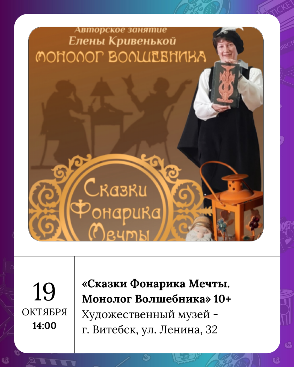 В рамках Недели Родительской любви 19 октября 2025 года в 14:00 в Художественном музее состоится авторское музейное занятие старшего научного сотрудника Елены Кривенькой: «Сказки Фонарика Мечты. Монолог Волшебника».