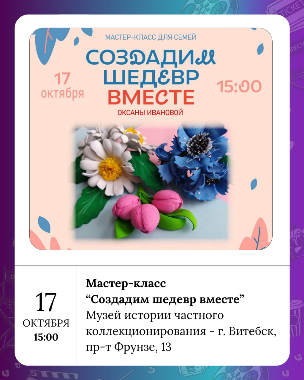 В рамках Недели родительской любви 17 октября в 15:00 в музее истории частного коллекционирования cостоится мероприятие “Создадим шедевр вместе”! Мастер-класс по изготовлению бутоньерок и брошей проведёт Оксана Иванова — педагог творческой мастерской “ДЕКО” отдела декоративно-прикладного искусства Витебского городского центра дополнительного образования детей и молодёжи.