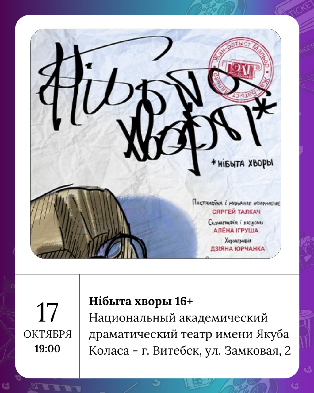 Национальный академический драматический театр имени Якуба Коласа сегодня, в пятницу, приглашает на спектакль Нібыта хворы 16+, а в Ляльке покажут Зыход 6+.
