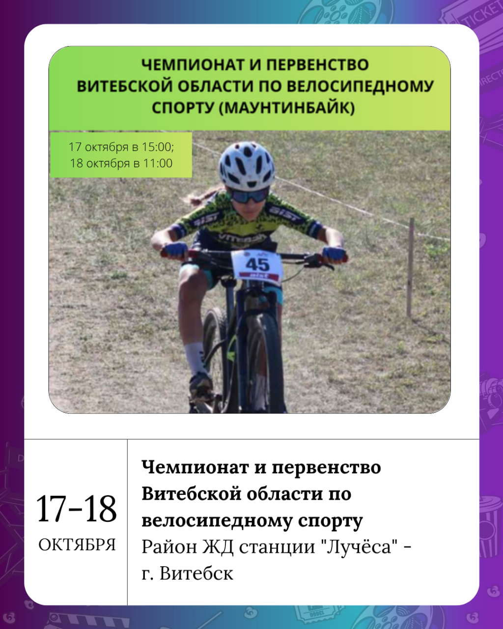 17-18 октября 2025 года в г.Витебске в районе станции ”Лучеса“ пройдут открытые чемпионат и первенство Витебской области по велосипедному спорту (маунтинбайк). Начало соревнований: 17 октября в 15:00; 18 октября в 11:00. Приходите поддержать своих фаворитов!