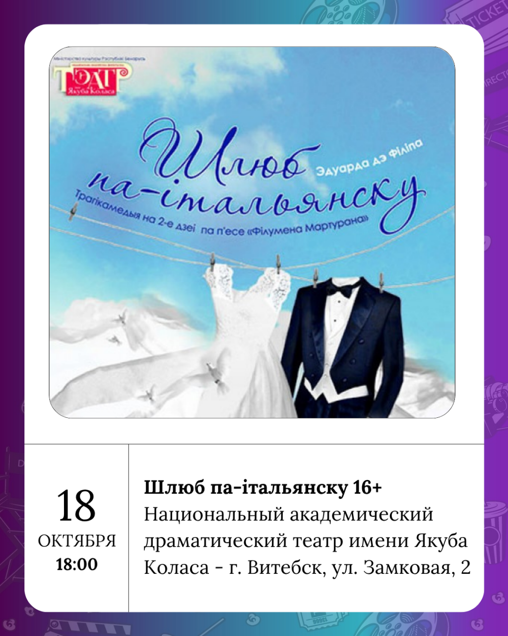 Шлюб па-італьянску 16+ представят в национальном академическом драматическом театре имени Якуба Коласа. Чарамара 7+ - в Ляльке. «И так сойдёт» 3+ - в филармонии.