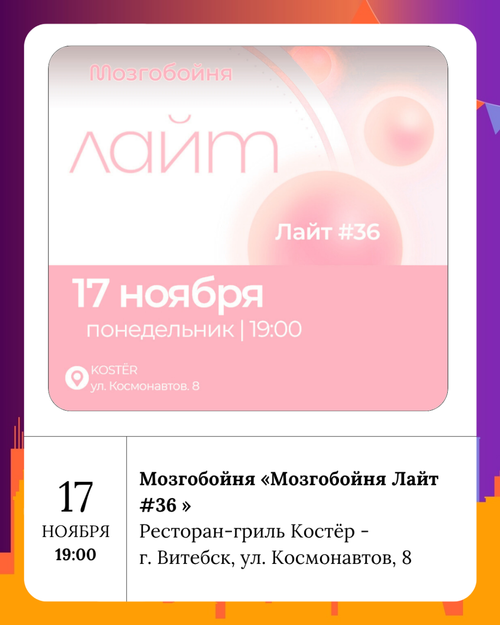 Не обойдем вниманием и Мозгобойню. Здесь сегодня Мозгобойня Лайт #36 — улётная игра для новичков и не только для них, а в четверг - Туц Туц Квиз #152 — классическая музыкальная игра с треками всех жанров и эпох.
