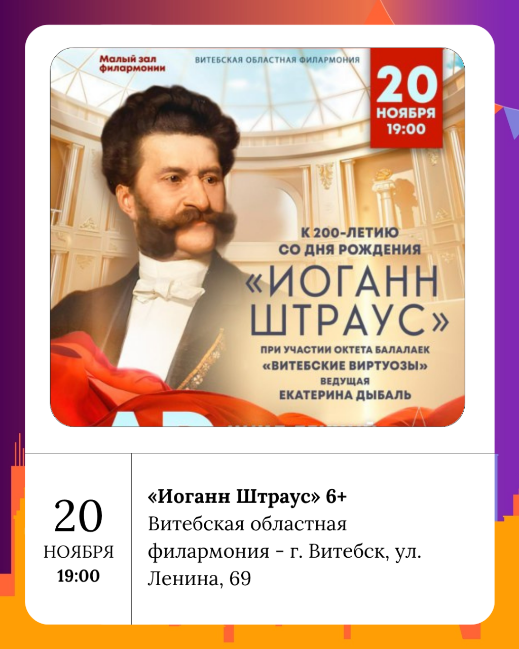 В среду витебская областная филармония приглашает на концерт ансамбля танца, музыки и песни "Талака" 6+, а в четверг на цикл лекций-концертов «Ad libitum» «Музыкальные истории». К 200-летию со дня рождения «Иоганн Штраус».