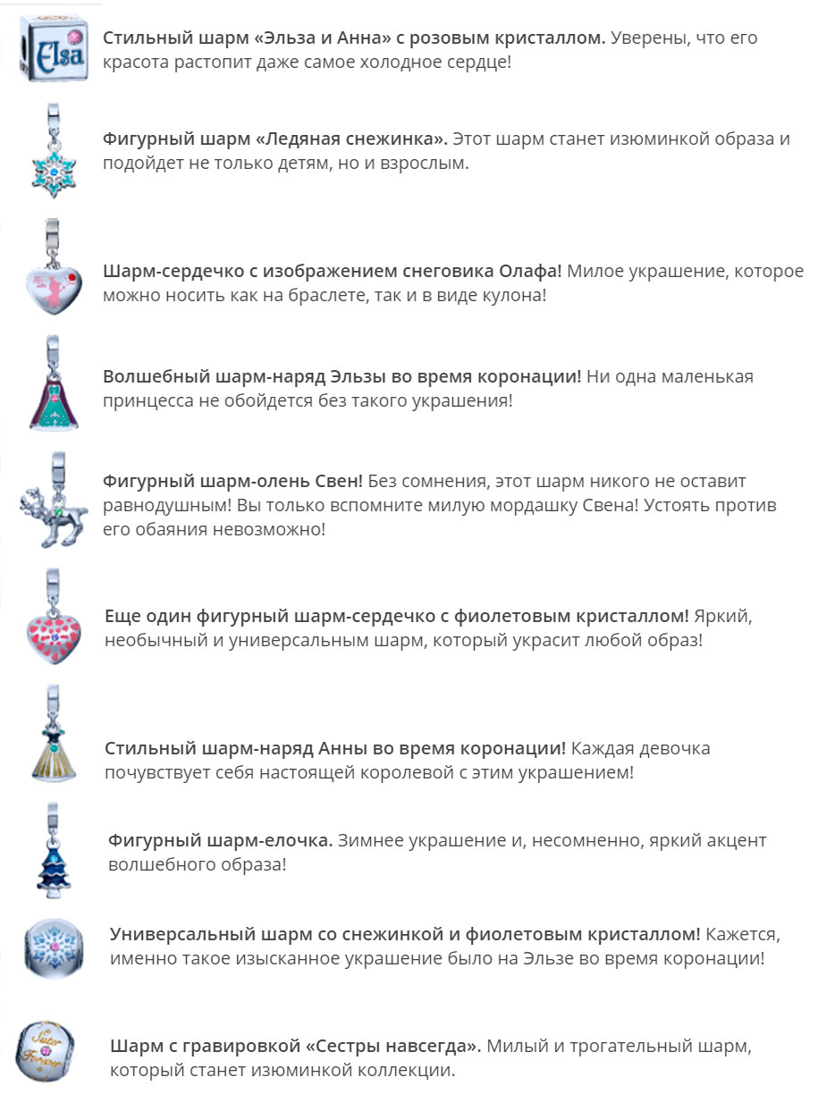 Обратите внимание: дисконтная программа «Магазин приятных покупок» не распространяется на покупк шармов по полной цене 19 рублей 99 копеек и браслета с шармом в виде снеговика Олафа по специальной цене 29 рублей 99 копеек. Количество акционных браслетов и шармов ограничено!