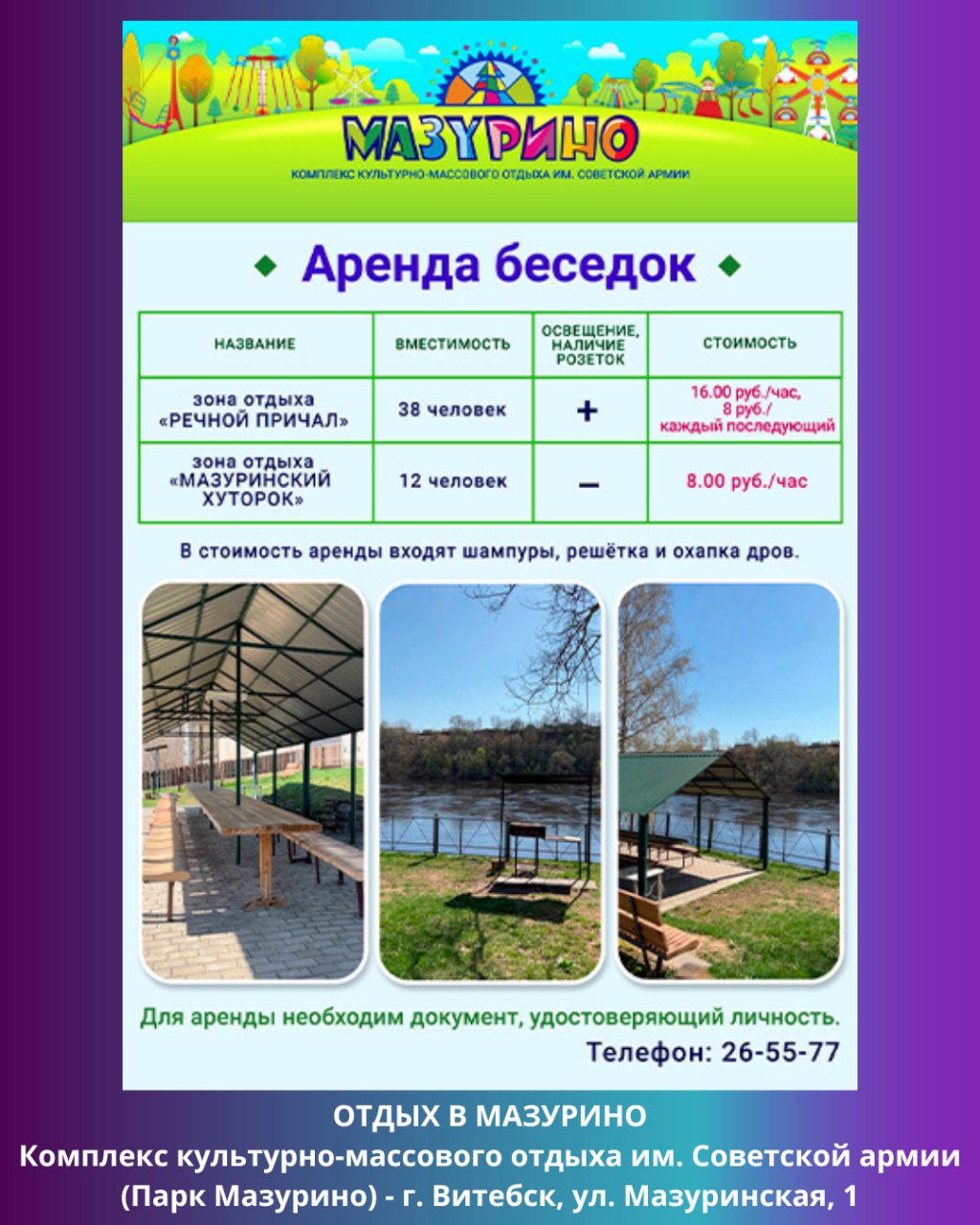 В такую погоду не сидится дома, правда? Можно отправиться в парк имени СОВЕТСКОЙ АРМИИ ГУ «ЦЕНТР КУЛЬТУРЫ «ВИТЕБСК» (Мазурино по-простому). Круглый год доступна аренда удобных и вместительных зон отдыха «РЕЧНОЙ ПРИЧАЛ» и «МАЗУРИНСКИЙ ХУТОРОК». Можно взять напрокат велосипед, скейтборд и роликовые коньки! Ну и конечно - покататься на аттракционах!