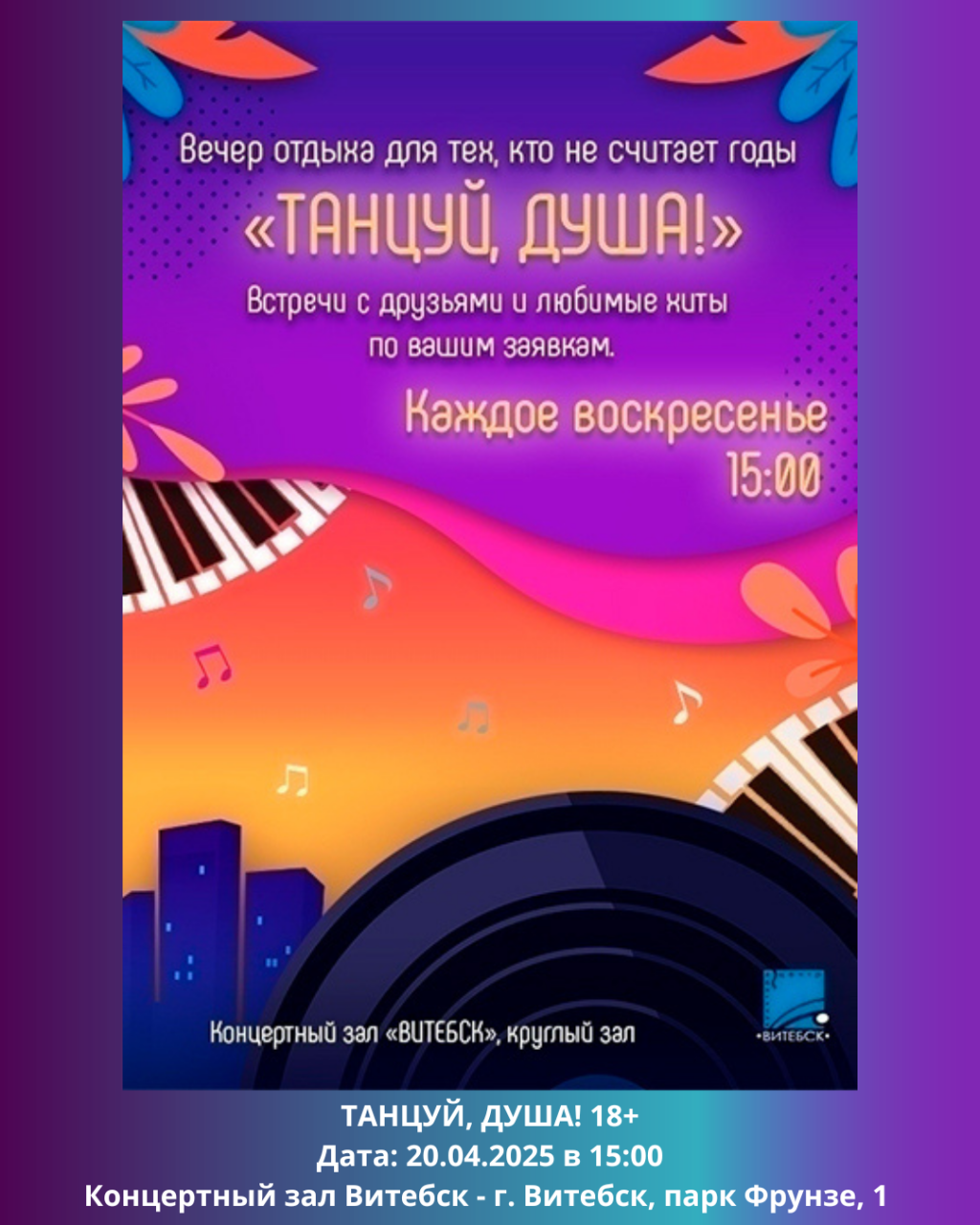 А еще "Центр культуры Витебск" приглашает на танцевальную программу «Танцуй, душа!». Любимое воскресное времяпрепровождение для тех, кому немножко за… 18 вернулось!