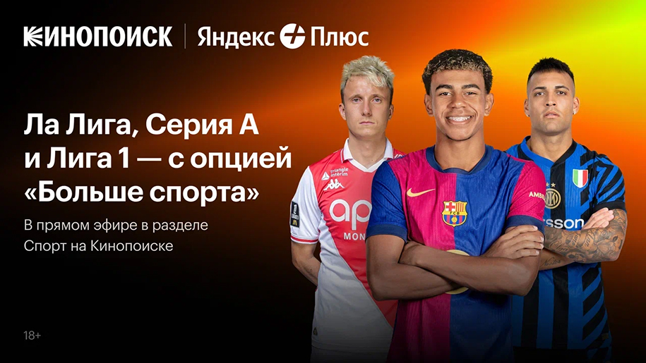 В новом спортивном сезоне для подписчиков Плюса на Кинопоиске стала доступна опция «Больше спорта». С ней можно смотреть матчи ведущих европейских чемпионатов: испанской Ла Лиги, итальянской Серии А и французской Лиги 1. Трансляции будут доступны как в прямом эфире, так и в записи. Оформить опцию могут подписчики Плюса с бесплатным 30-дневным триалом, а в честь запуска действует акция: первые 90 дней бесплатно, потом стоимость опции — 9,99 BYN ежемесячно.
