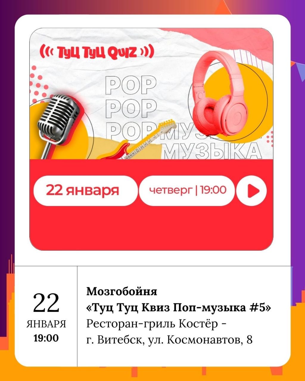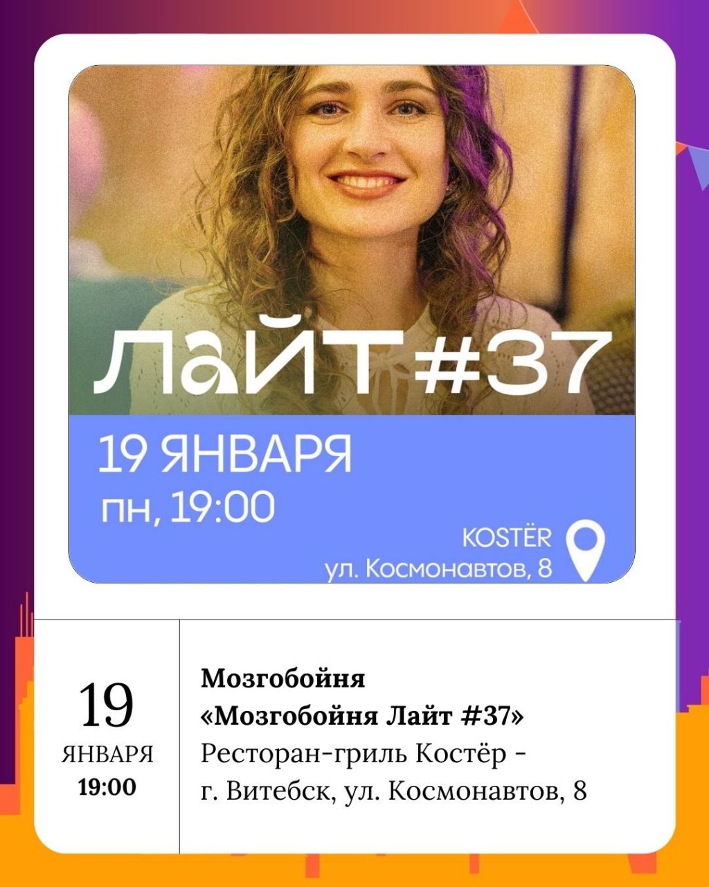 Итак, как вы уже, возможно, поняли, несмотря на морозы, Витебск не спит. В преддверии рабочей недели мероприятие за мероприятием собираются как снежинки под зимним небом, наполняя город жизнью. Так что, пусть этот понедельник будет для вас легким, а предстоящая неделя — удачной и продуктивной. Не забывайте утепляться и находить время для радости, даже когда за окном метет снежная буря!