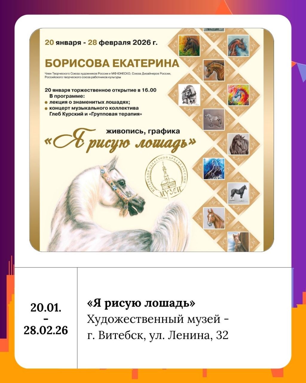 В художественном музее 20 января состоится торжественная презентация выставки художника-графика Екатрины Борисовой «Я рисую лошадь» (г. Москва). После презентации состоится авторская экскурсия, концерт музыкального коллектива «Групповая терапия» (художественный руководитель священник Глеб Курский).