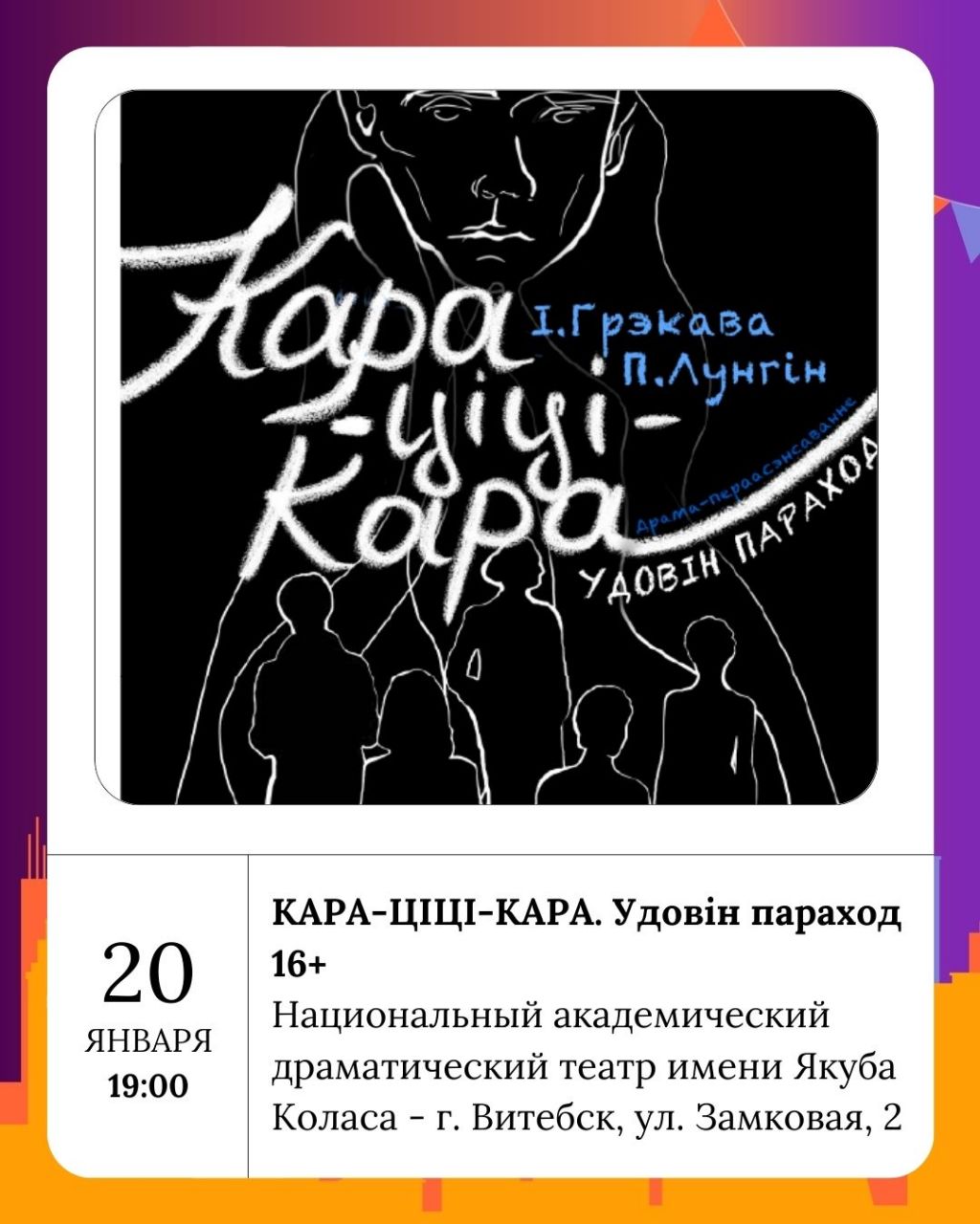 Национальный академический драматический театр имени Якуба Коласа во вторник приглашает на спектакль КАРА-ЦІЦІ-КАРА. Удовін параход 16+, в среду - на Любовь под гипнозом 16+, а в четверг на Незагойная рана 12+.