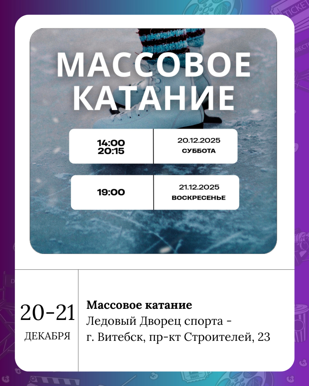 Расписание сеансов массового катания на этой неделе: 20 декабря — 14:00, 20:15, 21 декабря — 19:00.
