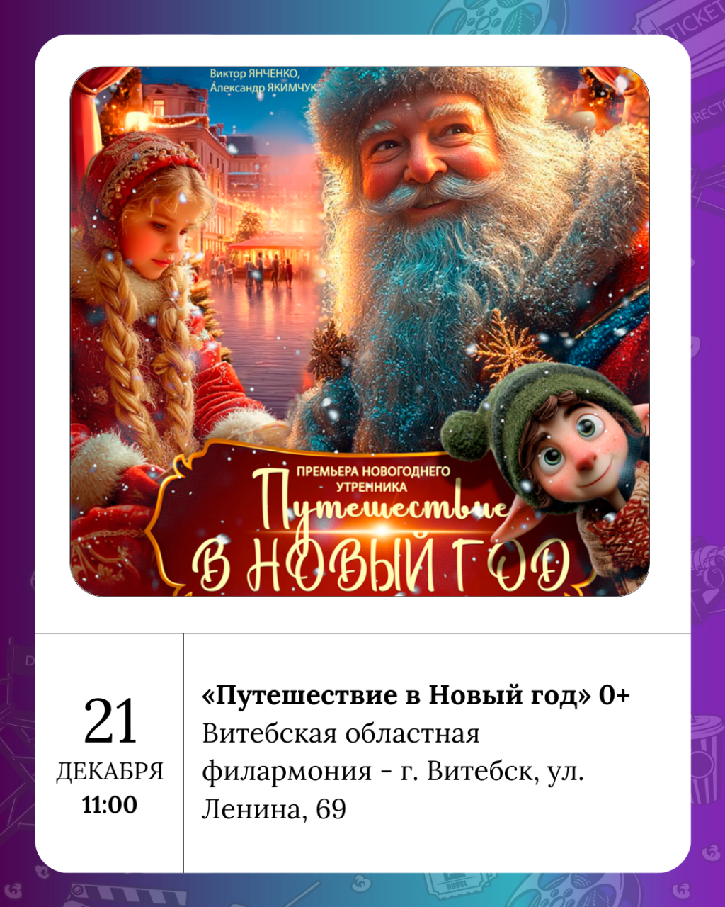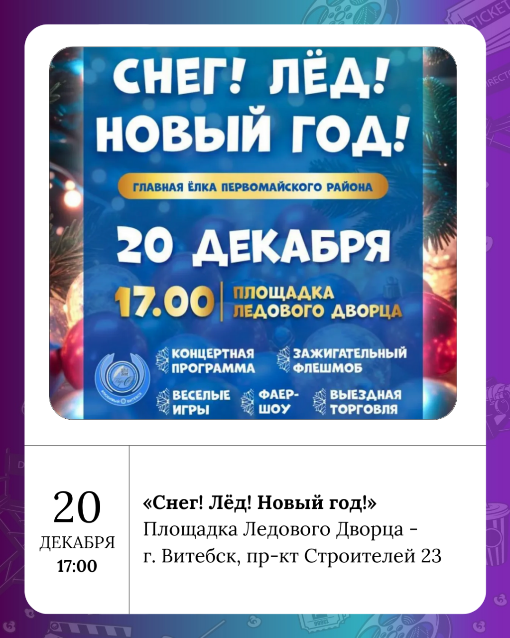 Пятница снова стучится в двери — и пусть завтра рабочая суббота, настроение всё равно праздничное! Витебск уже сияет огнями, витрины украшают ёлочные игрушки, а в воздухе витает запах мандаринов и ожидание чуда. До Нового года остаётся всего несколько дней, поэтому каждый вечер превращается в маленький праздник — отличный повод выбраться в город и зарядиться атмосферой.