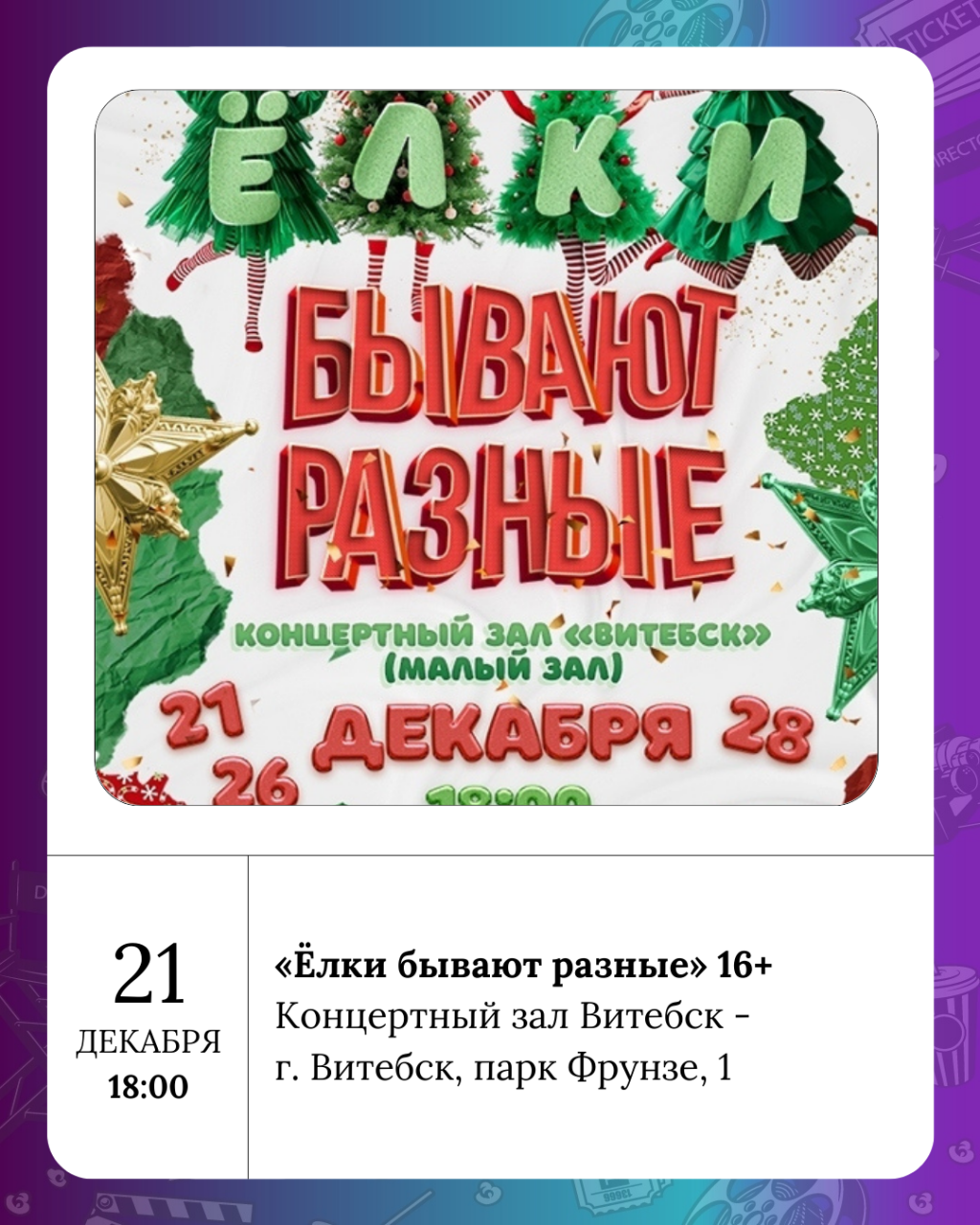 Молодёжный театр «Колесо» приглашает девушек и юношей 16+, мам и пап, бабушек и дедушек в концертный зал «Витебск» 21, 26 и 28 декабря в 18:00 на музыкальную комедию-иллюзион «Ёлки бывают разные».