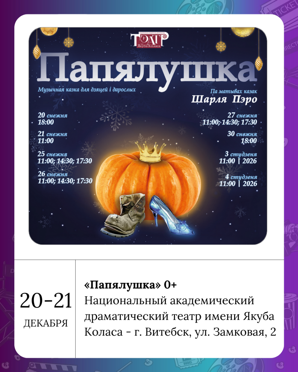 Национальный академический драматический театр имени Якуба Коласа своих маленьких поклонников приглашает на новогоднюю сказку Папялушка 0+ в субботу и в воскресенье.