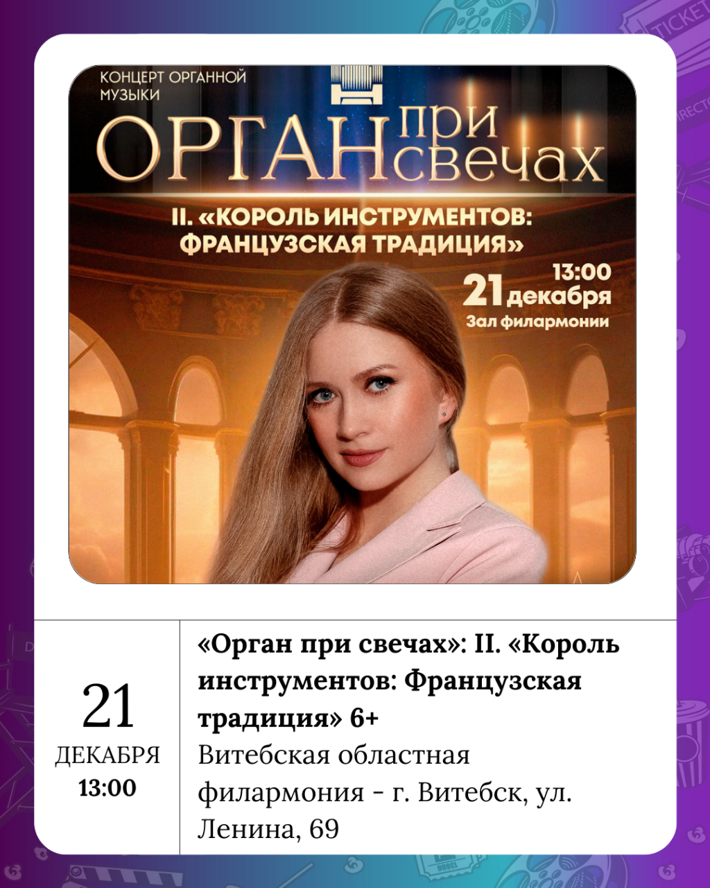 В этот же день Цикл концертов «Орган при свечах» продолжает исследование великих органных школ Европы. Вслед за немецкой школой наступает черед Франции, где орган по праву носит титул «короля инструментов».