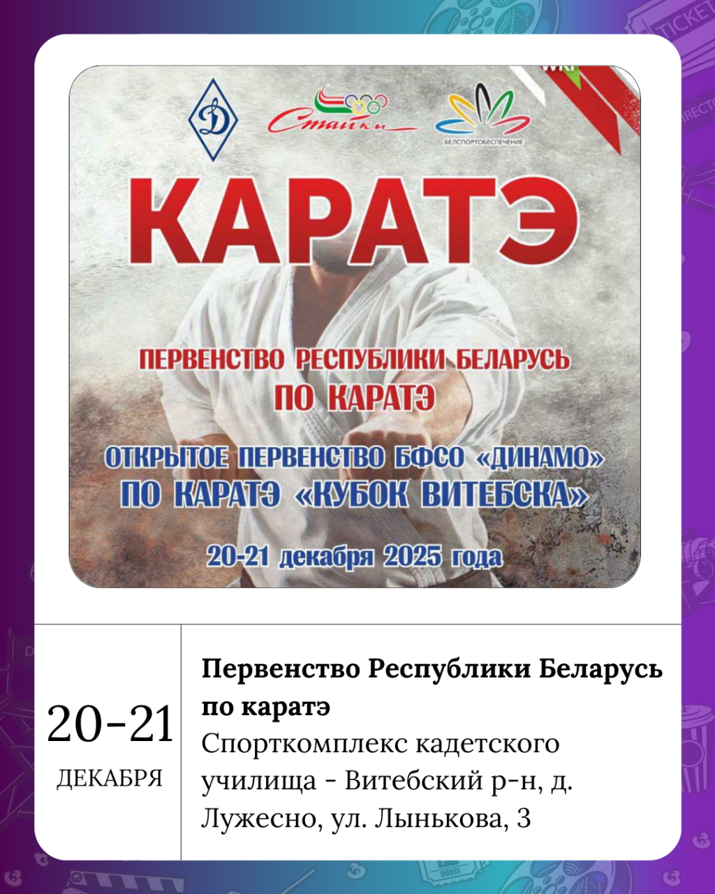 Любителей спорта ждёт Первенство Республики Беларусь по каратэ пройдет в спорткомплексе кадетского училища в субботу.