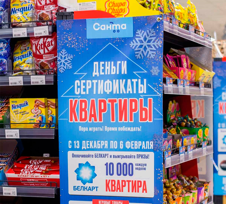 Розыгрыши проходят в режиме нон-стоп. Каждый день 5 счастливчиков выигрывают по сертификату на покупки в магазины сети на 100 рублей, еще один забирает денежный приз в 1000 рублей. Раз в неделю определяют обладателей 3 денежных призов в 10 000 рублей от «Санта» и еще одного с такой же суммой – от БЕЛКАРТ. А в феврале фортуна определит владельцев главных призов – двух однокомнатных квартир в Минске.