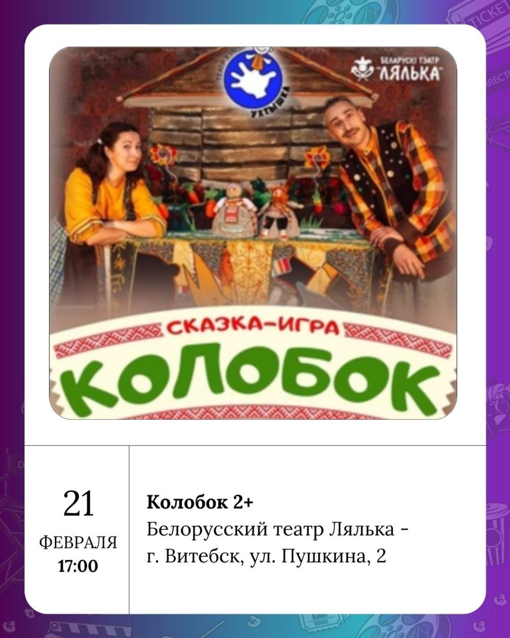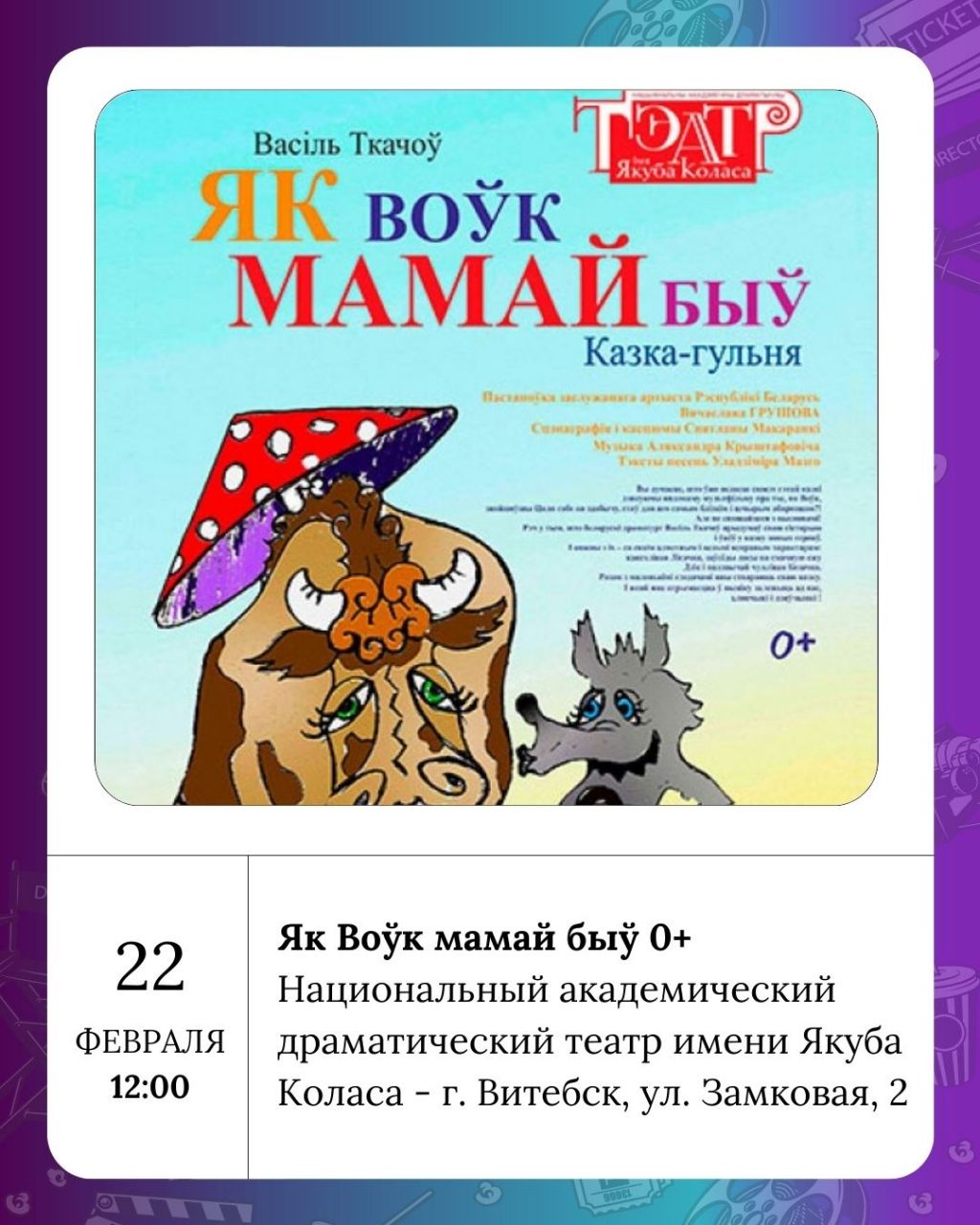 Театральная афиша субботы также богата: в Национальном академическом драматическом театре имени Якуба Коласа покажут спектакль «КАРА-ЦІЦІ-КАРА. Удовін параход» (16+). Белорусский театр Лялька приглашает на детские спектакли «Мыйдадзір» (3+) и «Колобок» (2+).