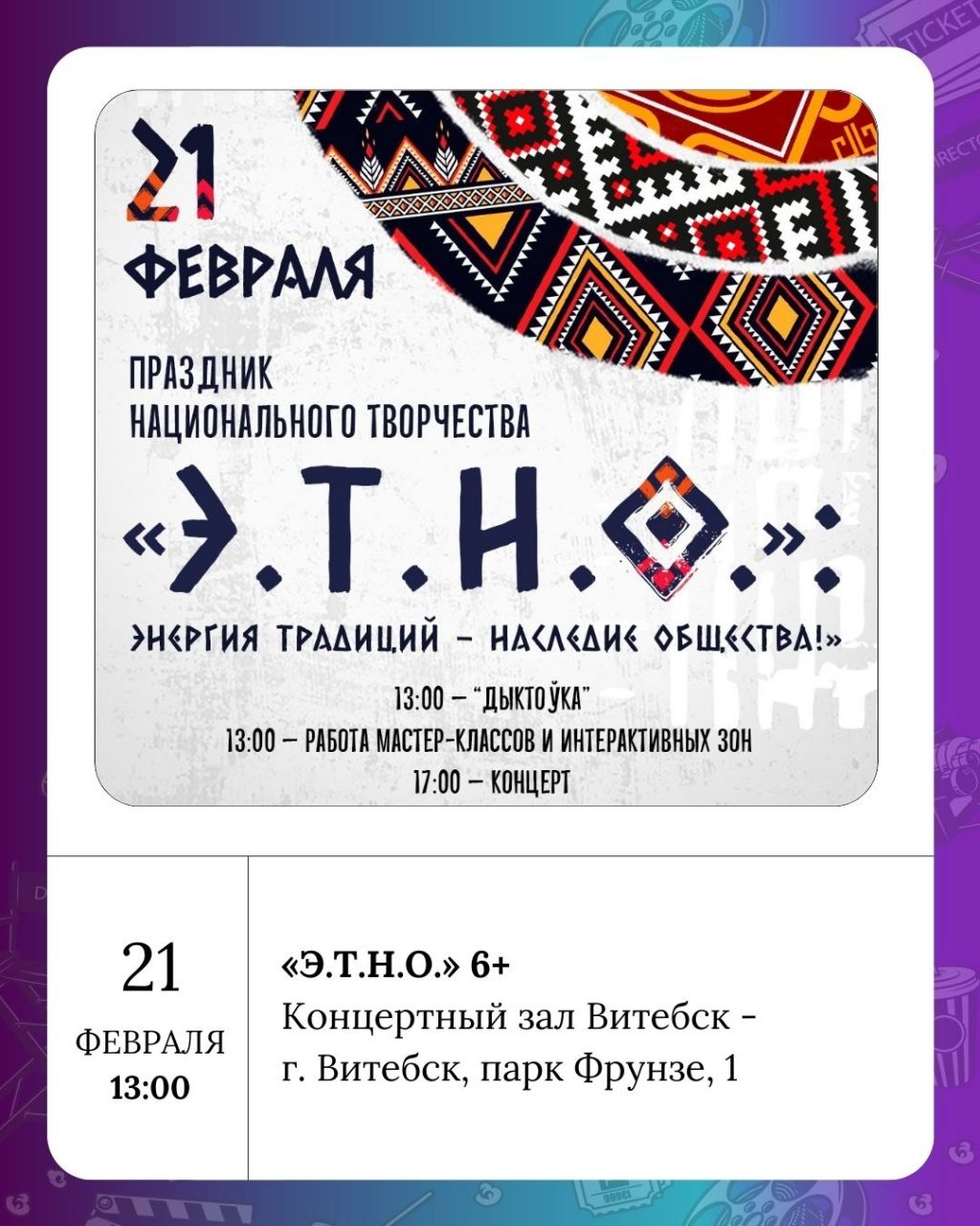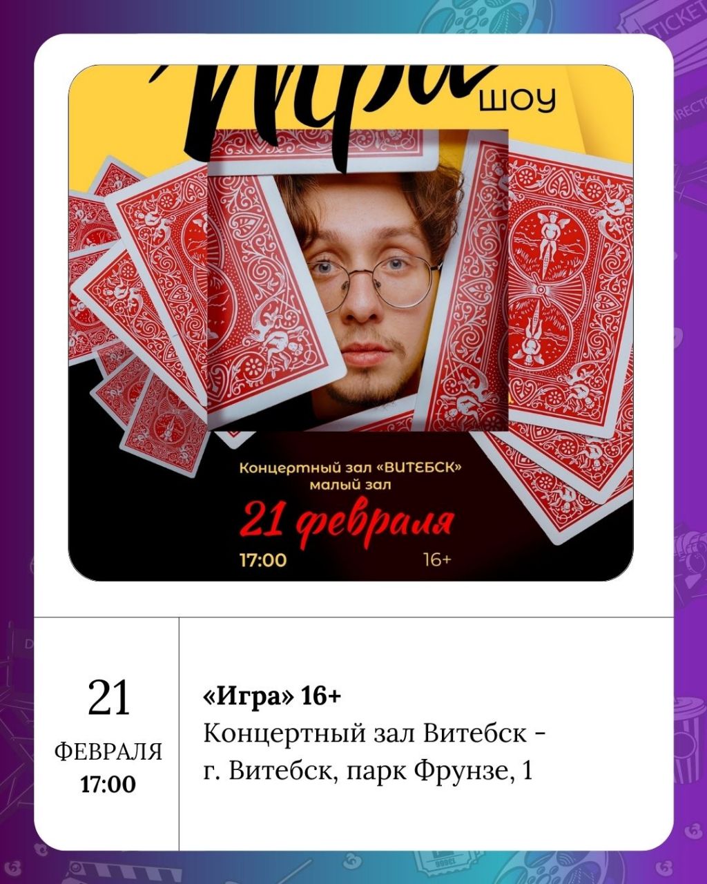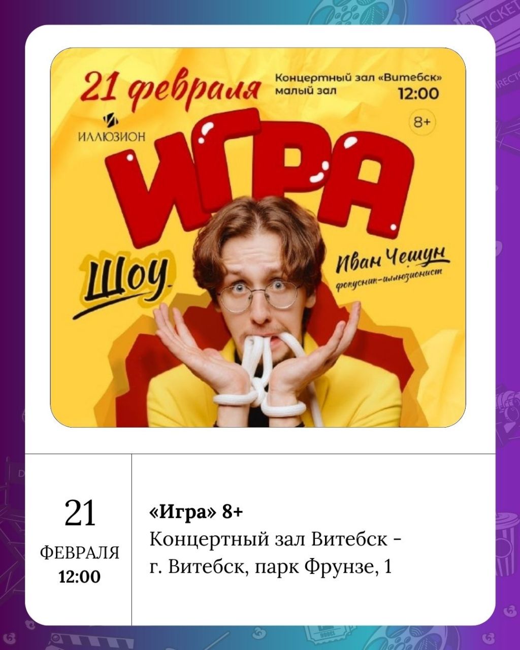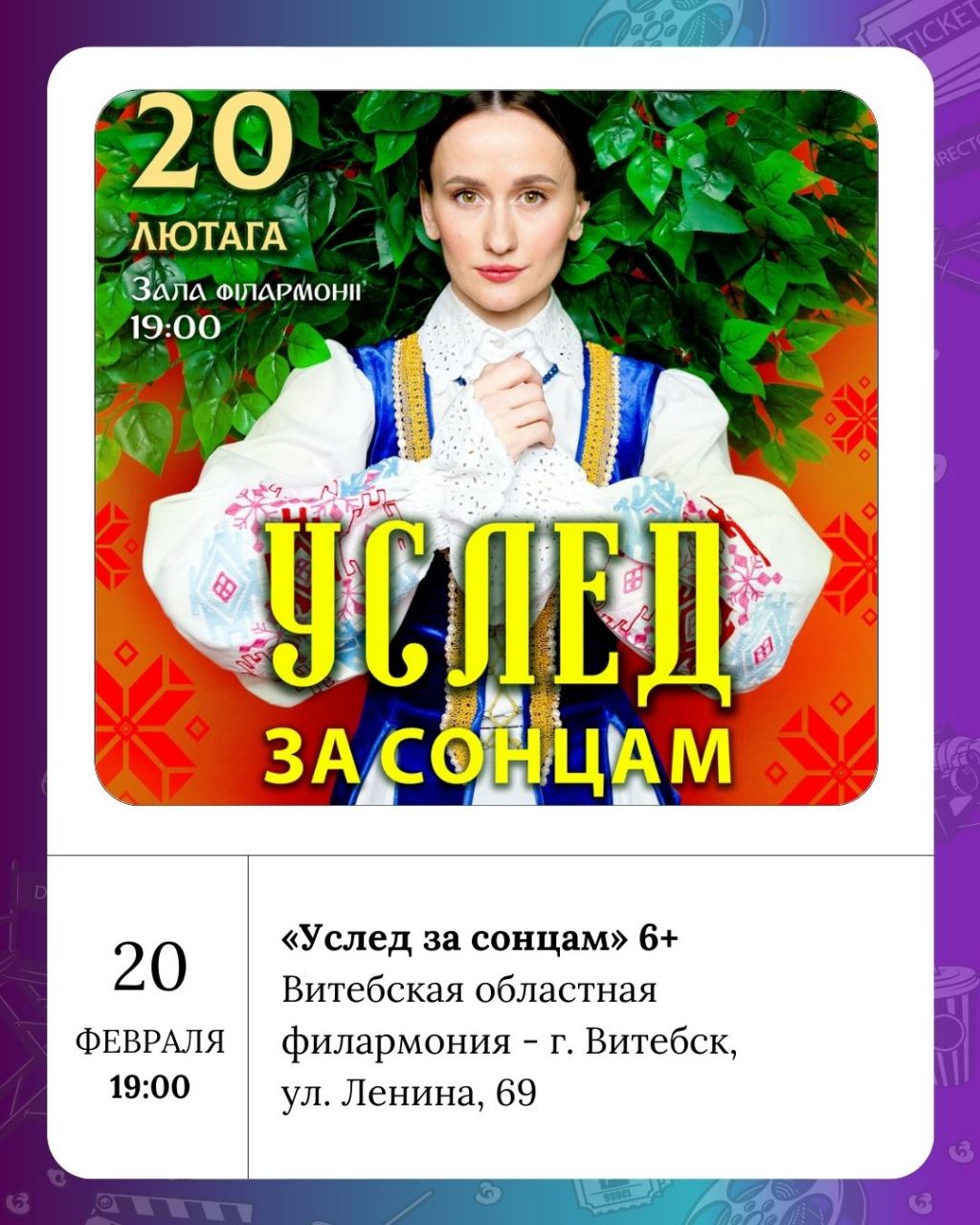 Для любителей зрелищ в Концертном зале Витебск пройдут шоу «Игра» (8+ и 16+). Витебская областная филармония предложит два мероприятия: детский праздник «День счастливой собаки» (0+) и концерт «Любовь побеждает всё» (6+). Также в Концертном зале Витебск состоится праздник национального творчества «Э.Т.Н.О.» (6+).