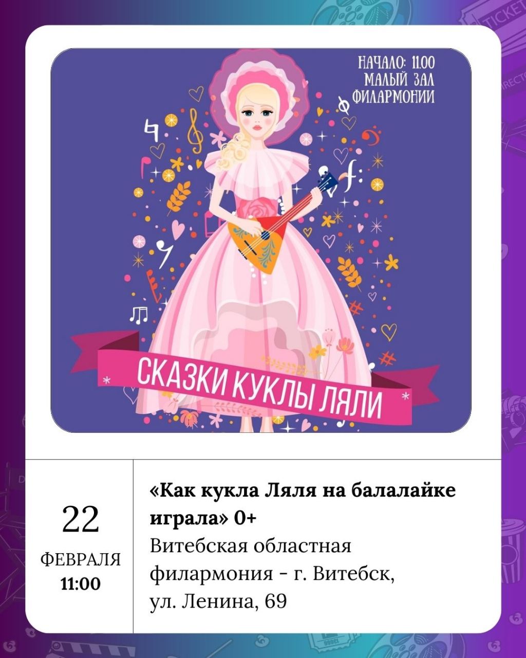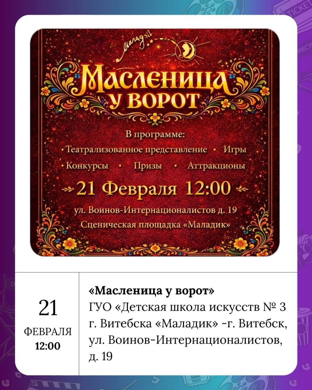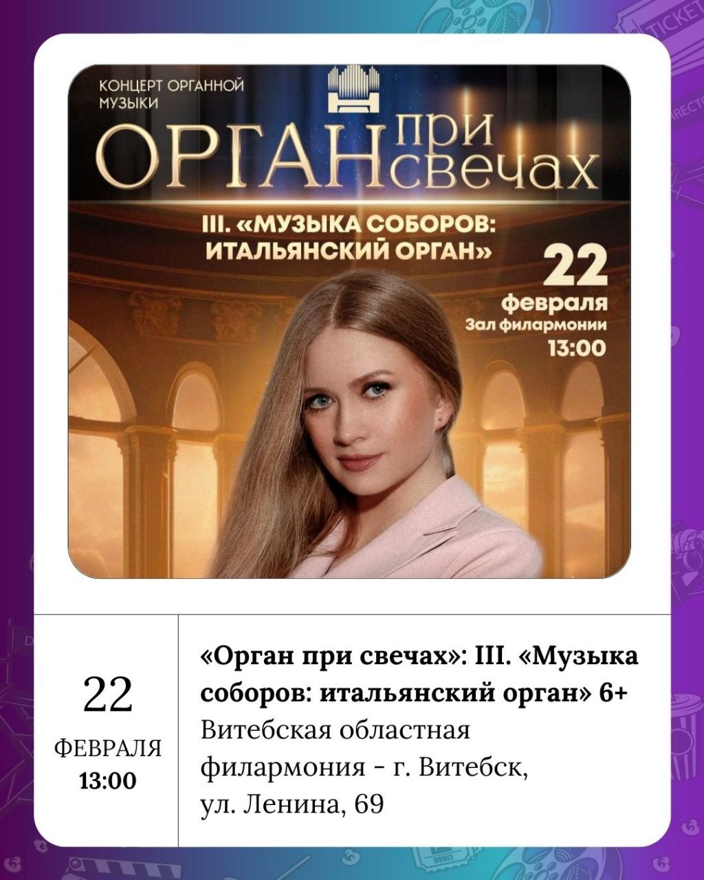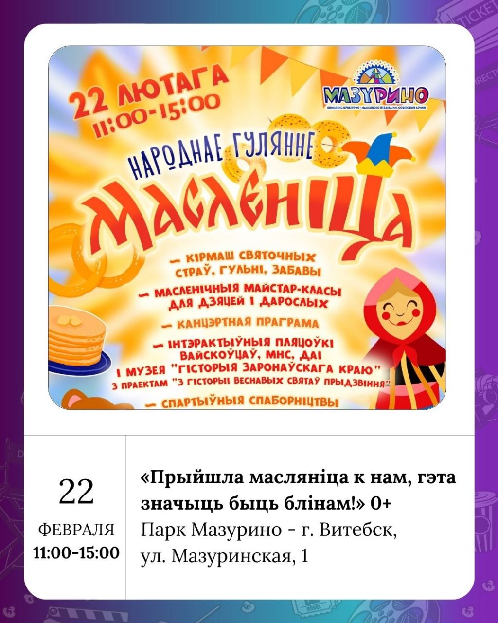 Витебская областная филармония предлагает два интересных события: цикл музыкальных программ для детей дошкольного возраста «Как кукла Ляля на балалайке играла» (0+) и органный концерт «Орган при свечах»: III. «Музыка соборов: итальянский орган» (6+). А в Комплексе культурно-массового отдыха им. Советской армии (Парк Мазурино) пройдёт народное гуляние «Прыйшла масляніца к нам, гэта значыць быць блінам!» (0+).