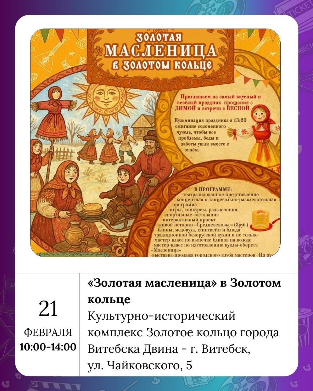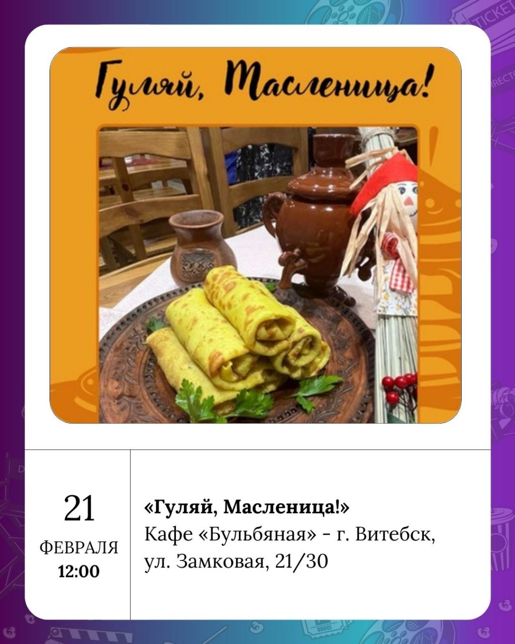 Завершение Масленичной недели также будет отмечено праздничными гуляниями: «Масленица у ворот» пройдет в Детской школе искусств № 3, «Золотая масленица» – в Культурно-историческом комплексе «Золотое кольцо города Витебска Двина», а кафе «Бульбяная» приглашает отведать вкусных блинов на «Гуляй, Масленица!».