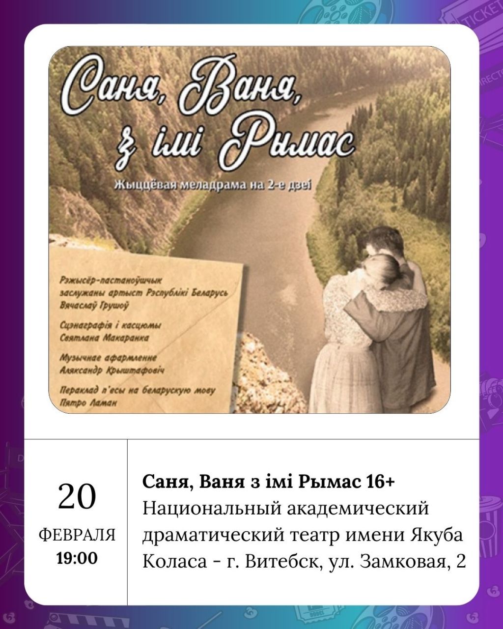 Вечер пятницы обещает быть насыщенным. В Национальном академическом драматическом театре имени Якуба Коласа можно будет увидеть спектакль «Саня, Ваня з імі Рымас» (16+). Оригинальную театрально-концертную программу «Калейдаскоп (не) звычайных гісторый» (16+) представит Белорусский театр Лялька. Если же вы предпочитаете музыкальные вечера, то в Витебской областной филармонии состоится концерт «Услед за сонцам» (6+).
