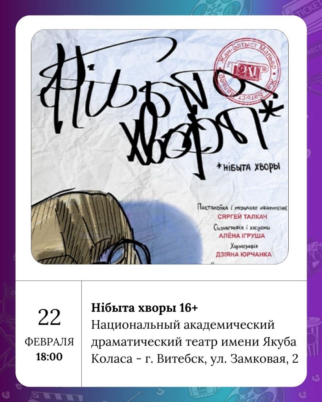 Воскресенье порадует как семейными, так и более серьёзными постановками. Национальный академический драматический театр имени Якуба Коласа представит детский спектакль «Як Воўк мамай быў» (0+) и постановку для взрослой аудитории «Нібыта хворы» (16+). Белорусский театр Лялька приглашает на праздник «Масленіца» (3+) где покажет спектакль.