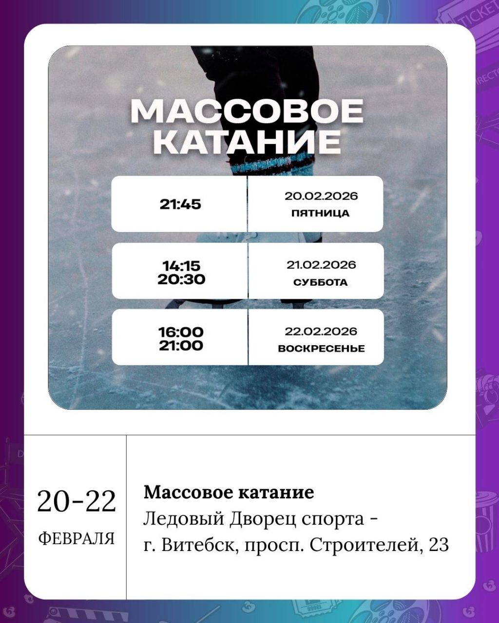 Расписание сеансов массового катания на этой неделе: 20 февраля — 21:45; 21 февраля — 14:15, 20:30; 22 февраля — 16:00, 21:00.