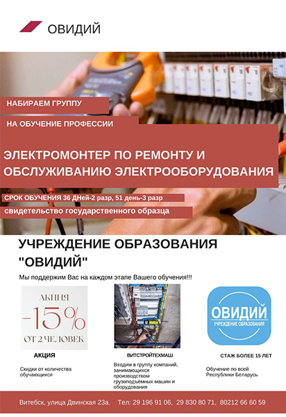 Есди находитесь в поиске работы или новой специальности - обратитесь в учебный центр Овидий. Там сейчас идет набор на обучение профессии Электромонтер по ремонту и обслуживанию электрооборудования.