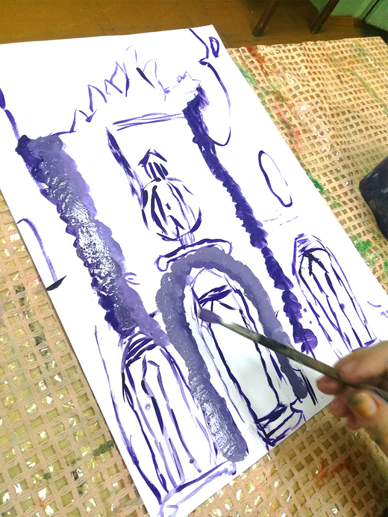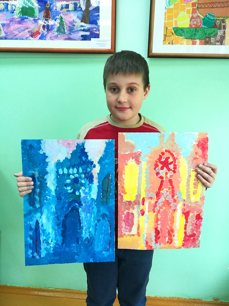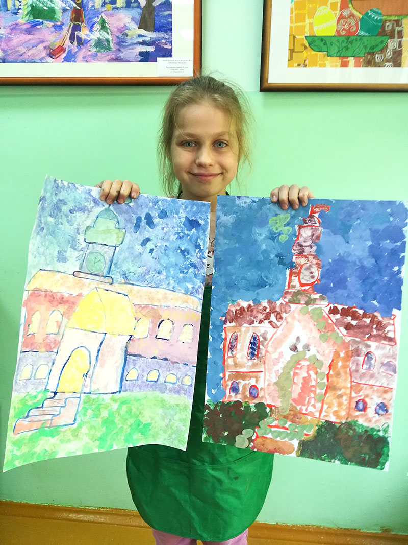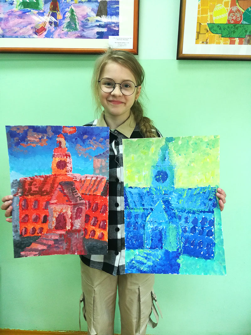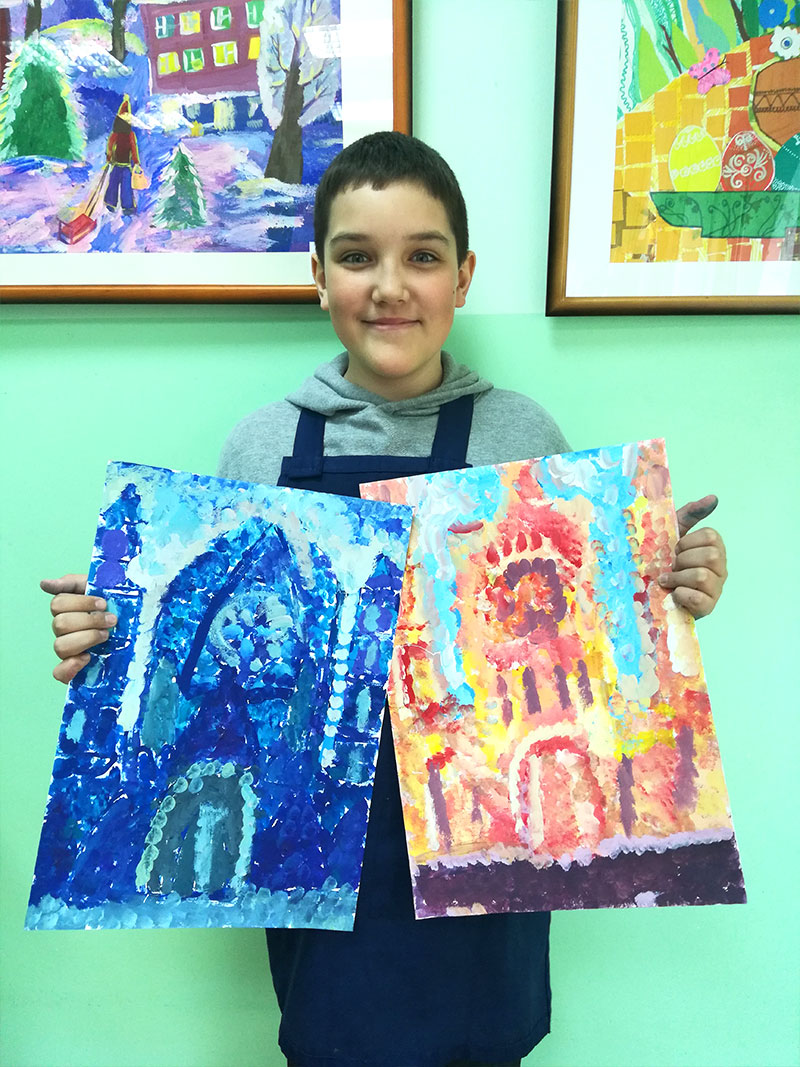 Изучая творчество Клода Моне, юные художники выполнили 2 рисунка одного и того же здания, но в разных состояниях и колоритах.