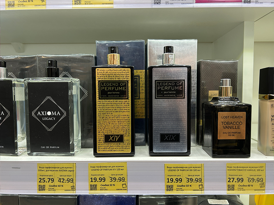 Парфюмерию можно купить дешевле до 60%. В числе акционных предложений – женская парфюмерная вода Lost Heaven Cherry, 100 мл, за 27,99 руб. За ту же стоимость можно приобрести мужскую парфюмерную воду Lost Heaven Tobacco Vanille объемом 100 мл. Туалетная вода для женщин Love you, 33 мл, обойдется всего в 7,99 руб., Elixir и Elixir Eclat, 50 мл – в 15,99 руб. Женская туалетная вода Caldion, 50 мл, доступна за 24,99 руб. Мужской парфюм Legend, 100 мл – за 19,99 руб.