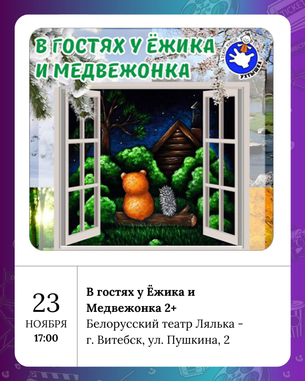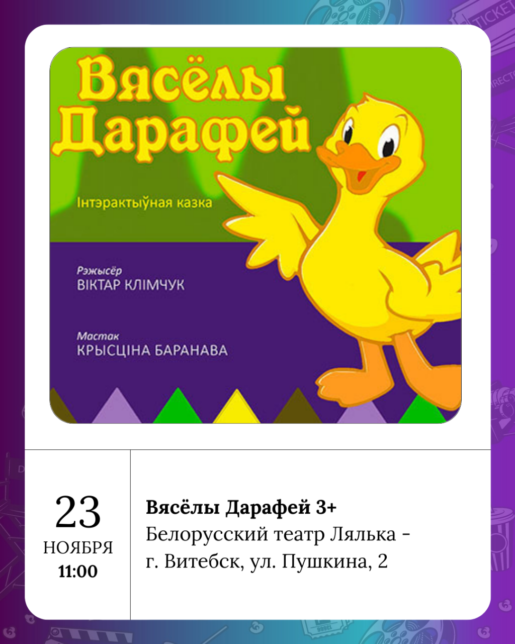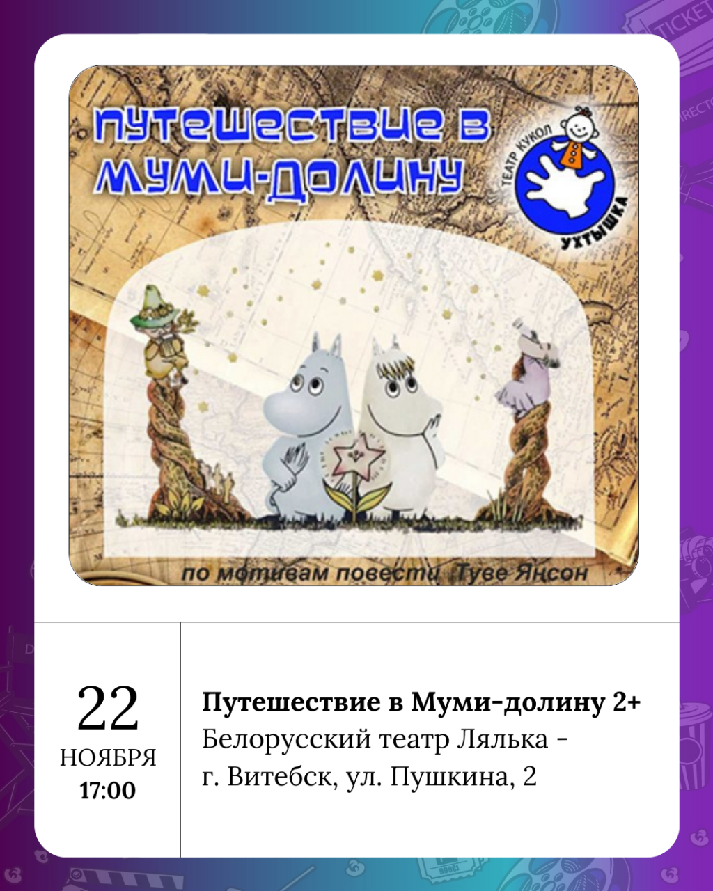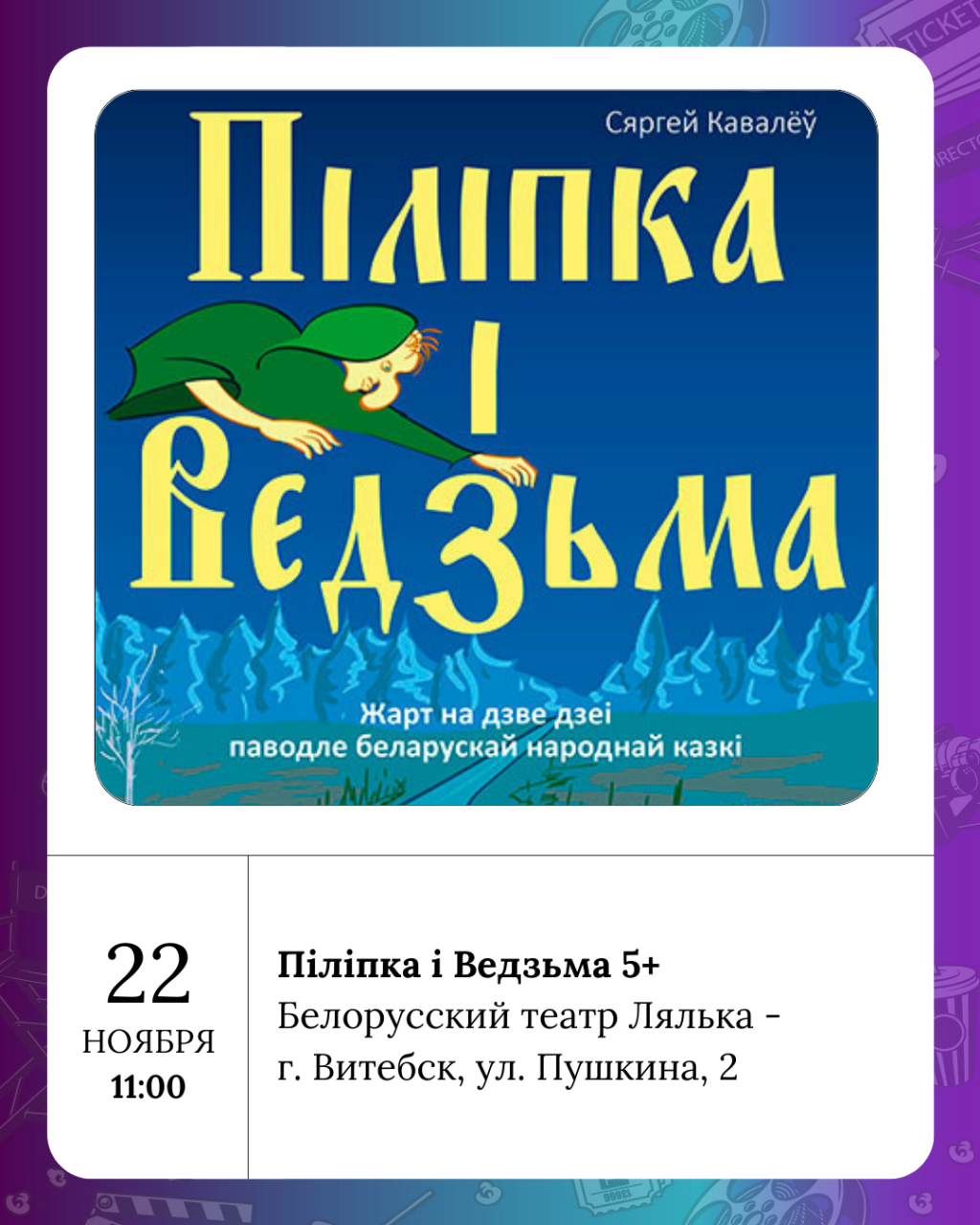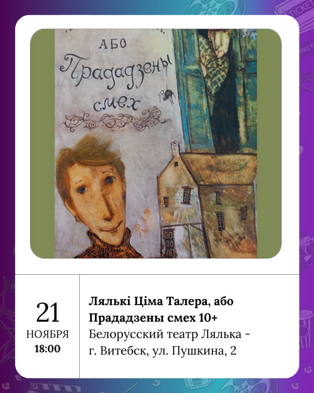 Лялька сегодня приглашает на Лялькі Ціма Талера, або Прададзены смех 10+, завтра на Піліпка і Ведзьма 5+ и Путешествие в Муми-долину 2+, а в воскресенье — на Вясёлы Дарафей 3+ и В гостях у Ёжика и Медвежонка 2+.