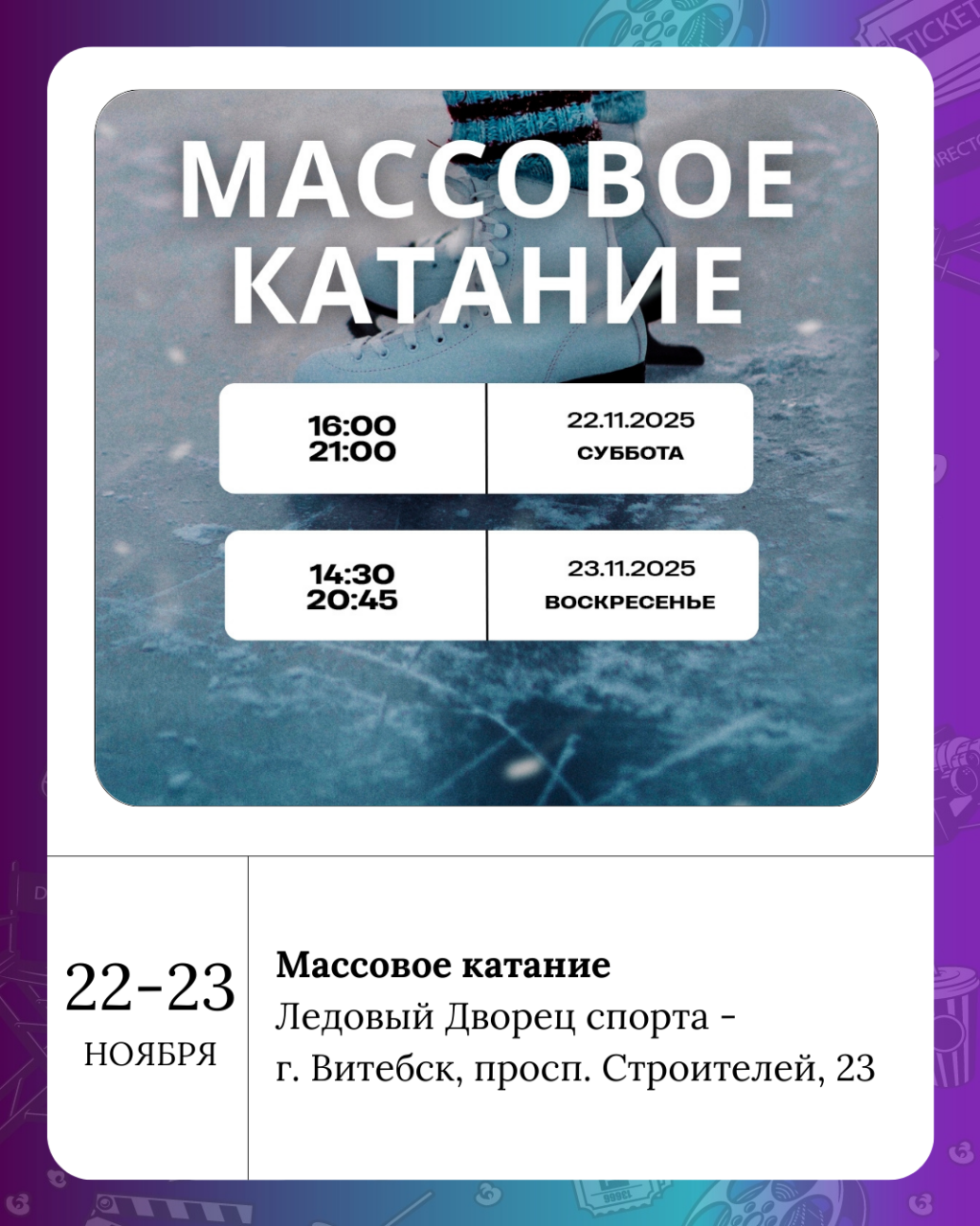 Расписание сеансов массового катания на этой неделе: 22 ноября — 16:00, 21:00, 23 ноября — 14:30, 20:45.