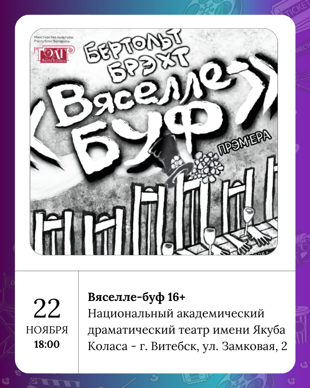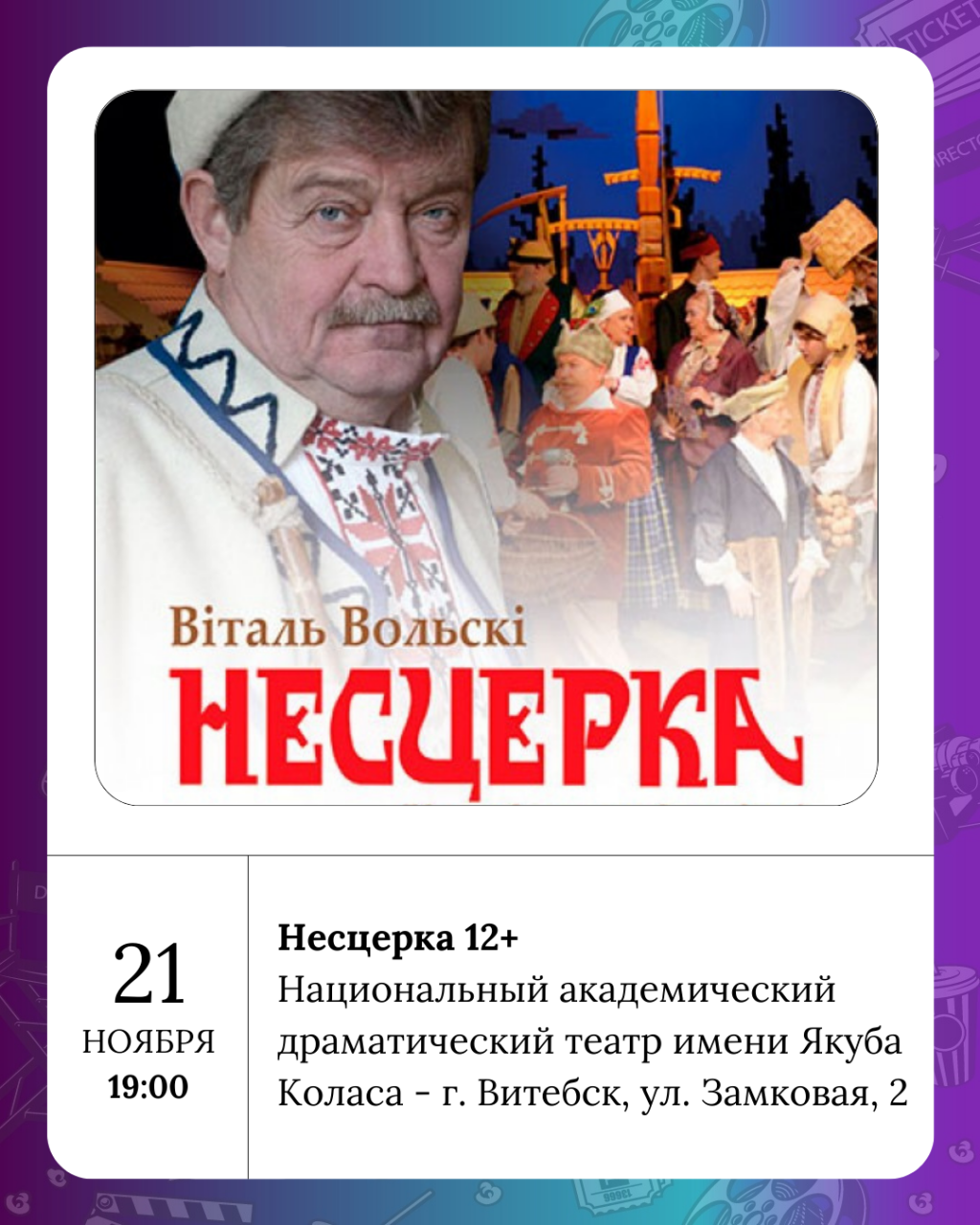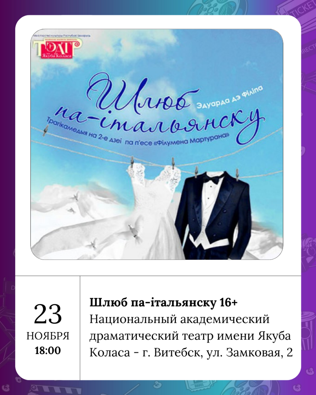 В Коласовском сегодня пройдет спектакль Несцерка 12+, завтра — Вяселле-буф 16+, а в воскресенье — Шлюб па-італьянску 16+.