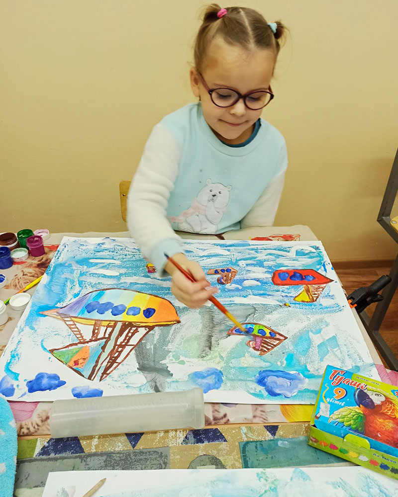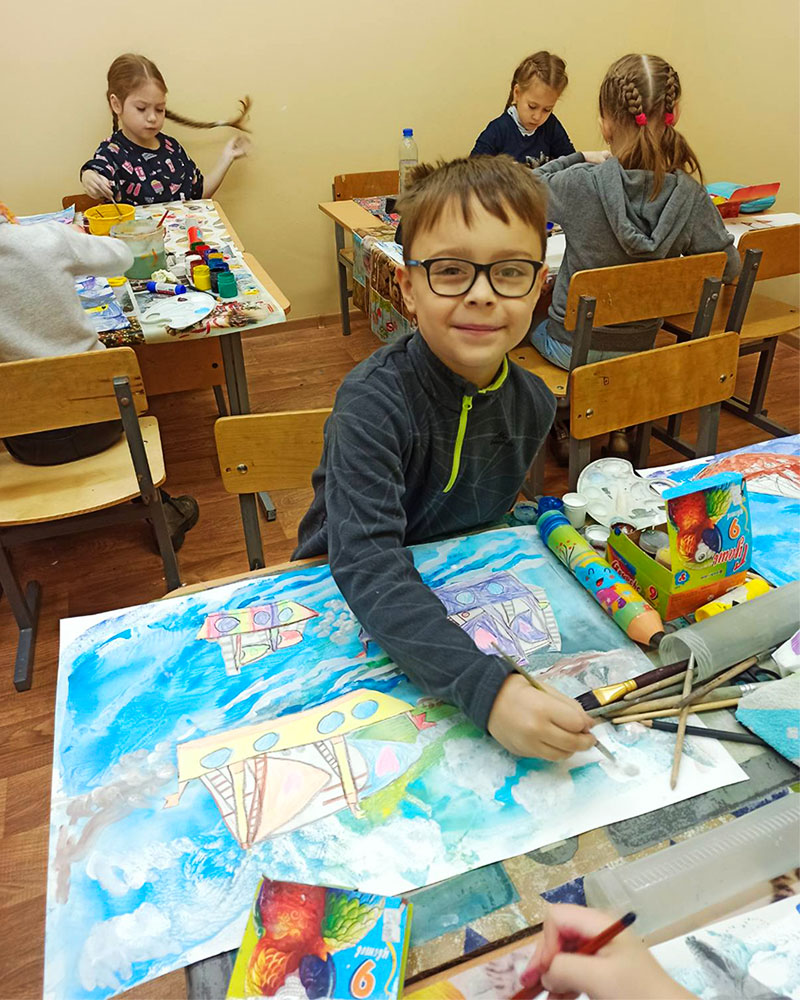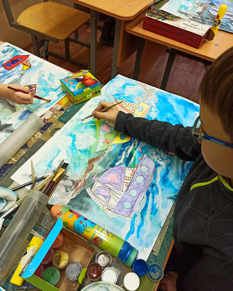 Для практической части урока Елена Викторовна выбрала смешанную технику исполнения. Первый этап работы - подготовка фона - дети выполнили в технике монотипия. Эта техника отлично подходит для изображения морской стихии. Каждый отпечаток создает неповторимый эффект движения волн. Пока фон подсыхал, дети фломастерами нарисовали корабли и, вырезав, приклеили их на фон. Далее, в технике “мазок” гуашью ученики дорисовали морской пейзаж, учились смешивать “цвет морской волны” и мазками показывать направление ветра. Получилась очень интересная серия морских пейзажей.