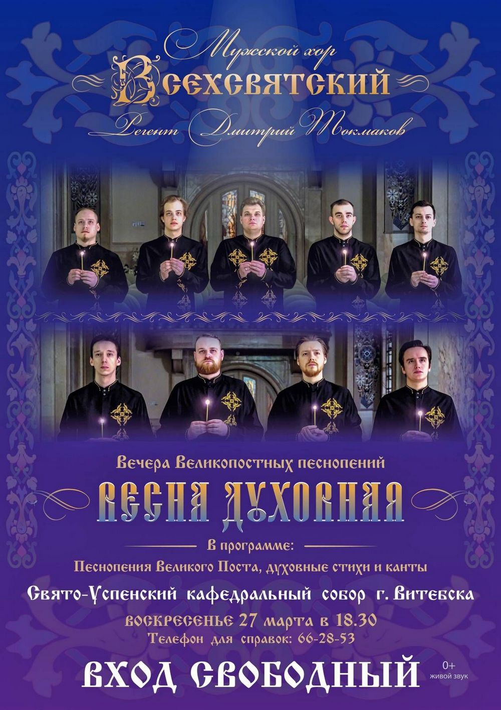 Этот единственный в стране профессиональный церковный мужской хор выступит в Витебске 27 марта в Свято-Успенском кафедральном соборе (18.30). В программе – песнопения Великого поста, духовные стихи и канты.