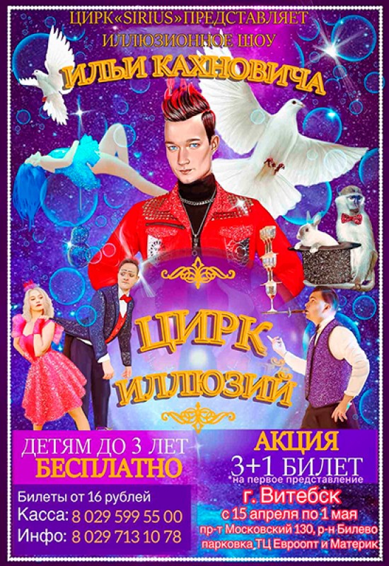 По 1 мая самое волшебное событие года - иллюзионное шоу европейского масштаба Цирк иллюзий! Авторский проект, роскошные костюмы, современные спецэффекты! Волшебство и иллюзии Лас-Вегаса, а также легендарные трюки великих Гарри Гудини и Дэвида Копперфильда.