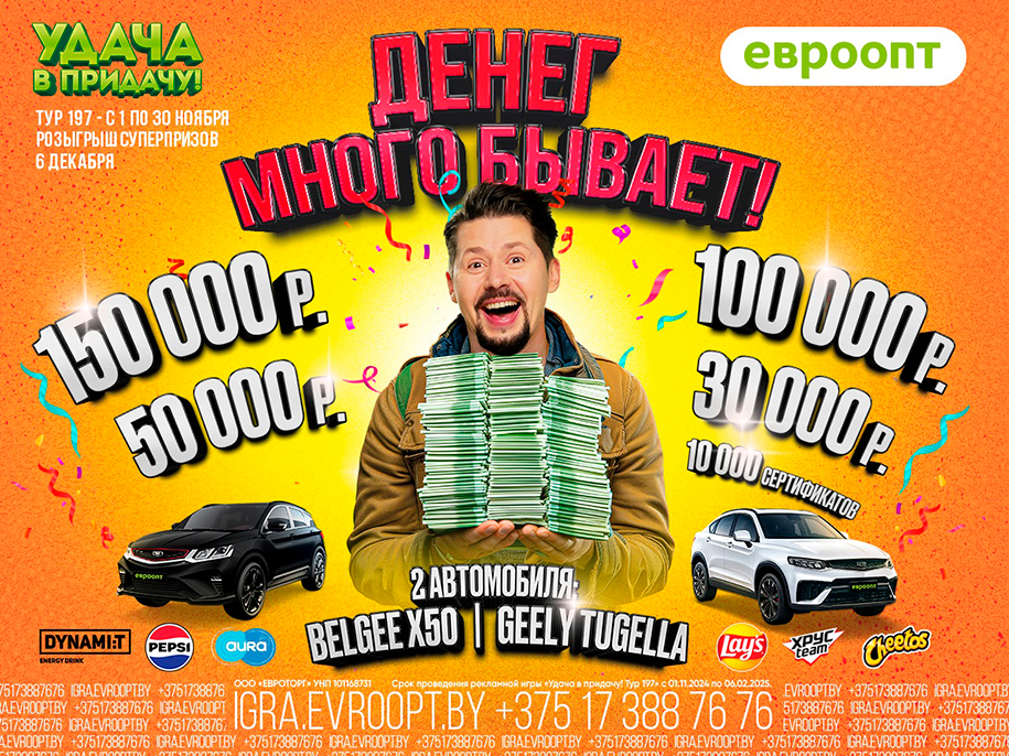 «Евроопт» разыграет крупные денежные призы в 197-м туре игры «Удача в придачу!». Кто-то станет богаче на 150 000 рублей, а еще один покупатель получит 100 000 рублей. Также будут разыграны 50 000, 30 000 рублей и два автомобиля – кроссоверы Geely Tugella и Belgee X50. А еще – 10 000 подарочных сертификатов на 10 рублей.
