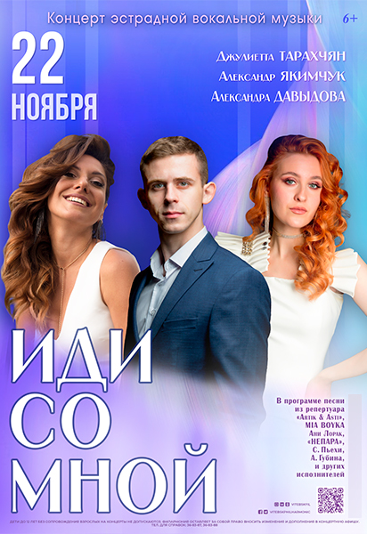 Концерт вокальной эстрадной музыки «ИДИ СО МНОЙ» 6+ пройдет сегодня в Витебской областной филармонии. В программе - песни из репертуара Anna Asti, А. Чумакова, Л. Чеботиной, А. Губина, Ж. Фриске и других исполнителей.